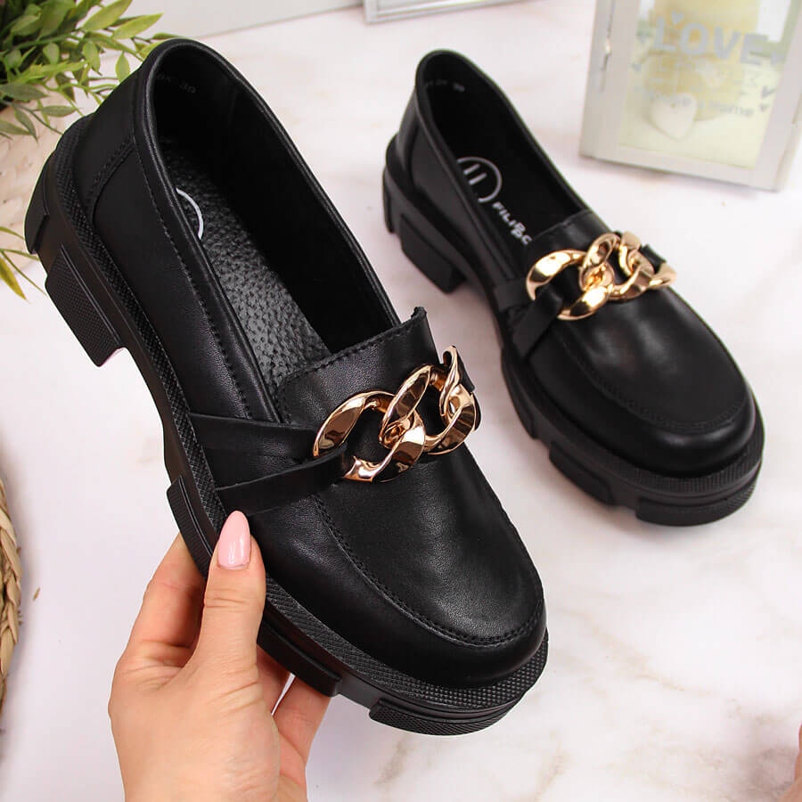 Descoperă pantofi de damă din piele extrem de la modă cu lanț în negru de la renumitul brand Filippo. Acești pantofi extrem de stilați sunt complementul perfect pentru orice stil de femei, combinând eleganța cu confortul extraordinar. Lantul decorativ care decoreaza acest model ii confera o stralucire unica, facand chiar si cele mai simple tinute sa capete un caracter unic.