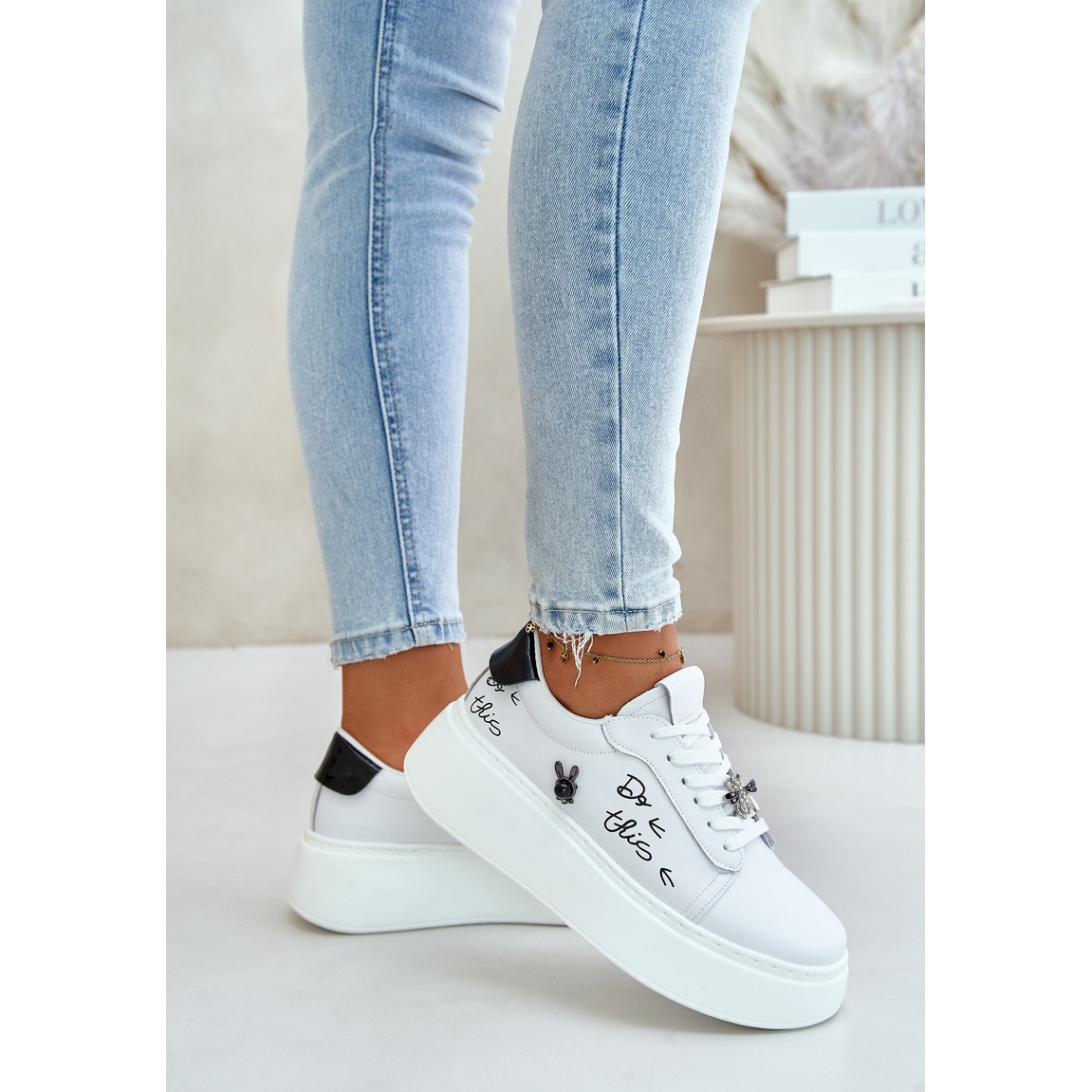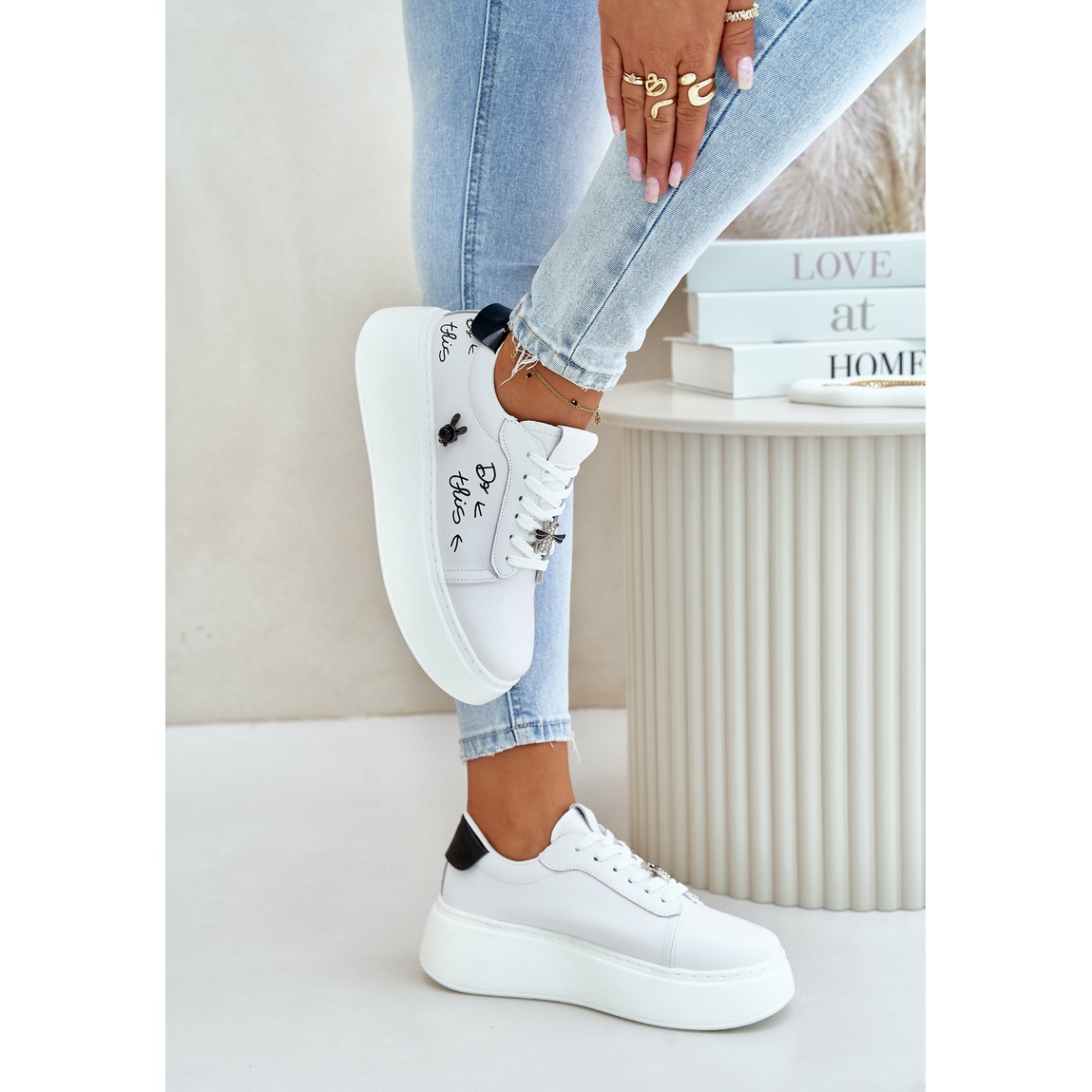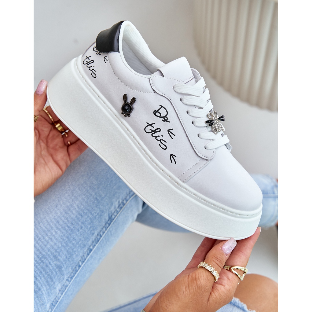 Vă prezentăm adidași de piele pentru femei pe platformă cu ace și inscripția Vincez 89102 în alb. Acești pantofi eleganți, din piele naturală, sunt o combinație perfectă de confort și design la modă, care va funcționa în stilizări de zi cu zi.