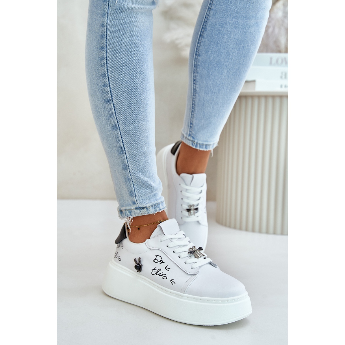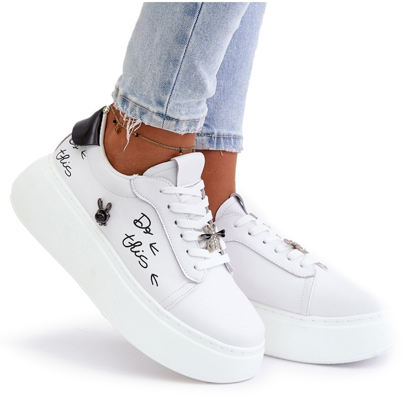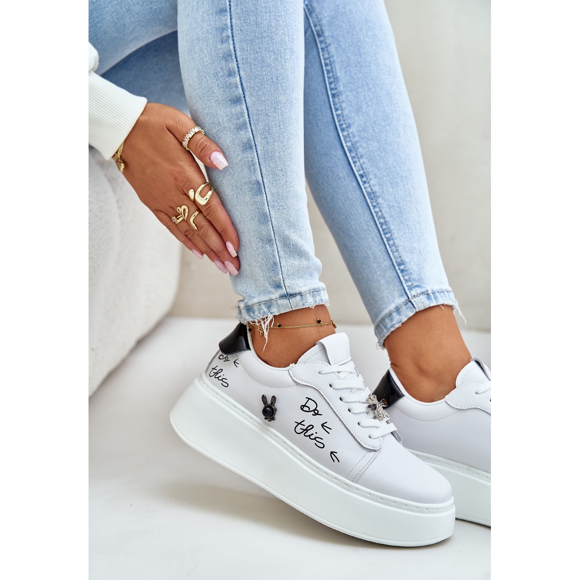 Vă prezentăm adidași de piele pentru femei pe platformă cu ace și inscripția Vincez 89102 în alb. Acești pantofi eleganți, din piele naturală, sunt o combinație perfectă de confort și design la modă, care va funcționa în stilizări de zi cu zi.