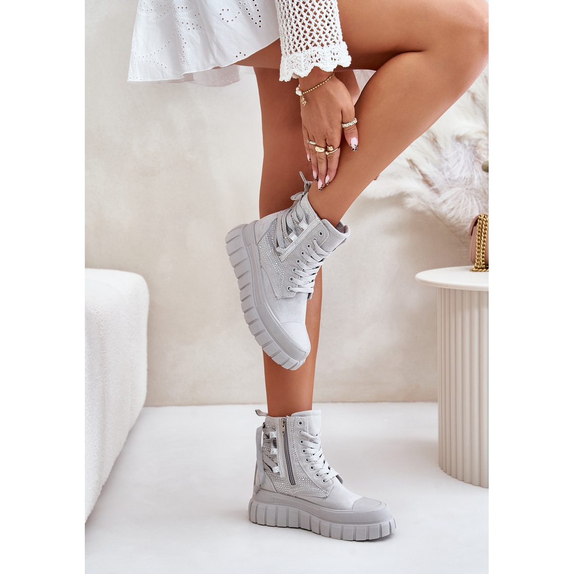 Detalii: Pantofi de damă înalți pe o platformă masivă cu decorațiuni, gri Zaidria