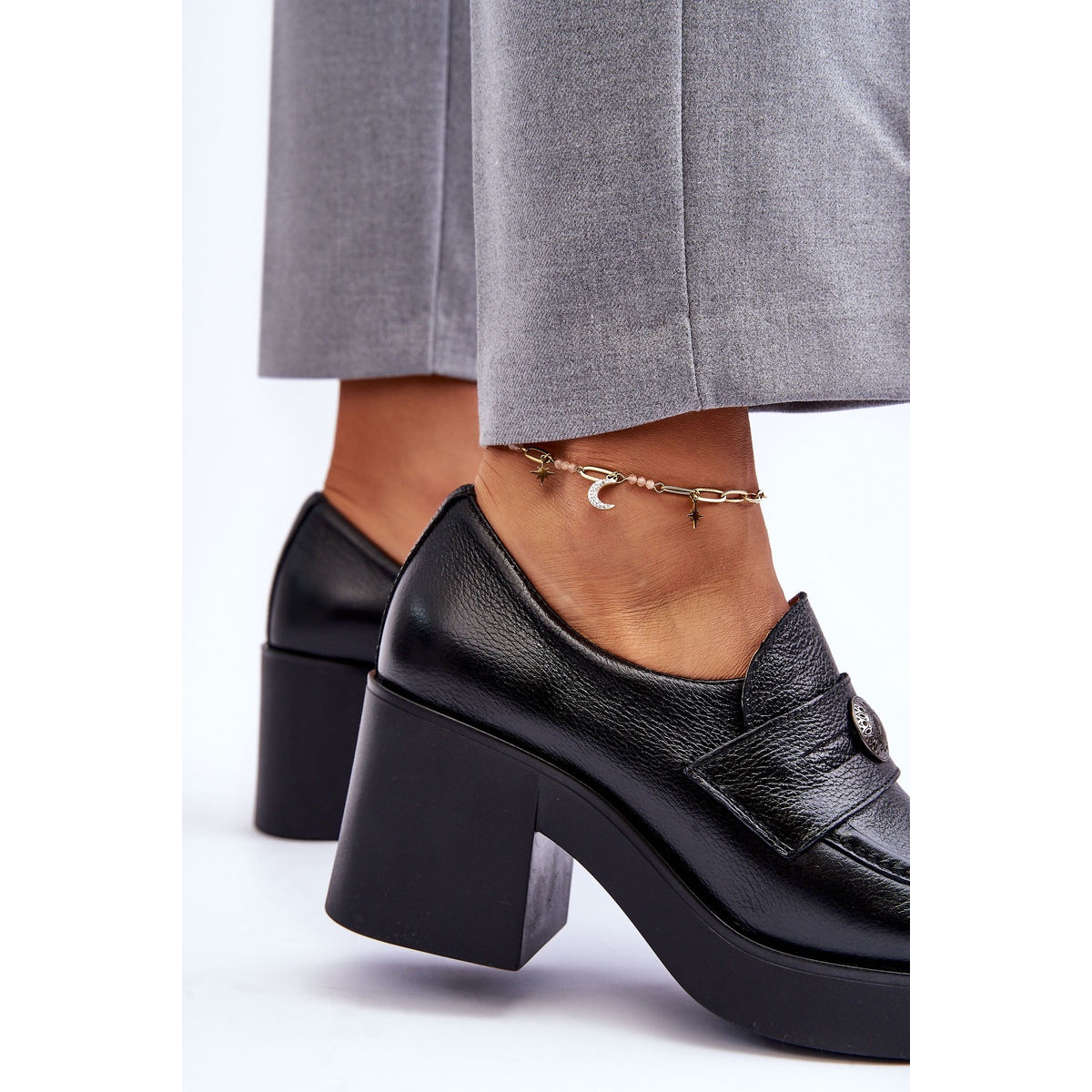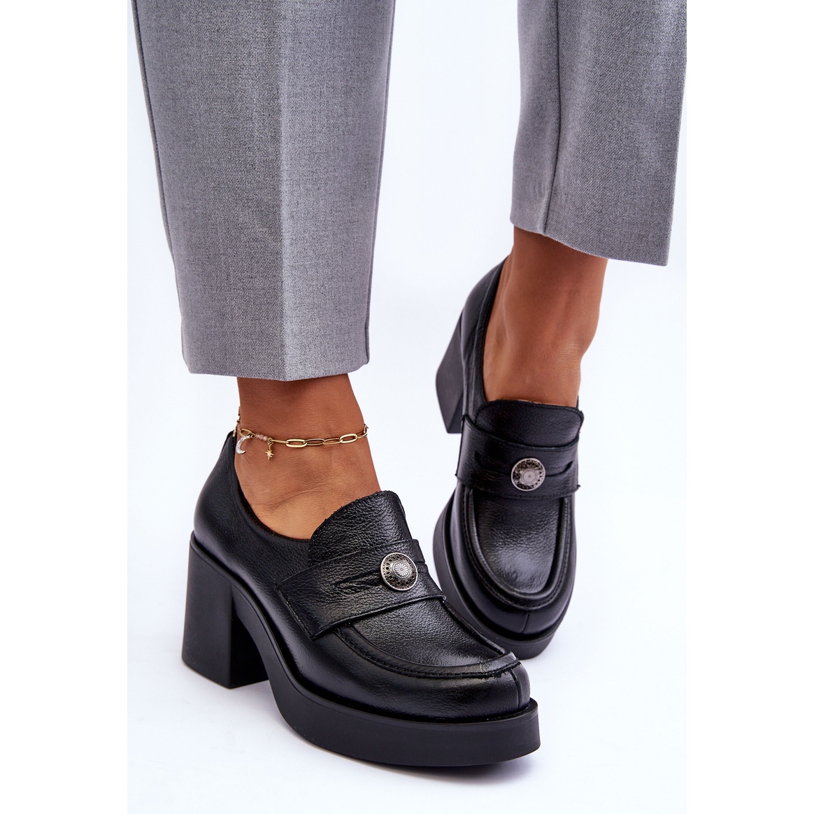 Tocuri înalte elegante care combină clasicii cu confortul. Superioara, insertul și interiorul sunt confecționate din piele naturală, ceea ce asigură confort și durabilitate. Un pilon larg, cu o înălțime de 8 cm și 2,5 cm Platforma oferă suport stabil și subțire cifra, fără a renunța la confort. Modelul este echipat cu un element de fixare glisant, cu un elastic elastic sub limbă pentru potrivirea perfectă, un aspect rigidizat și un decor subtil pe curea.