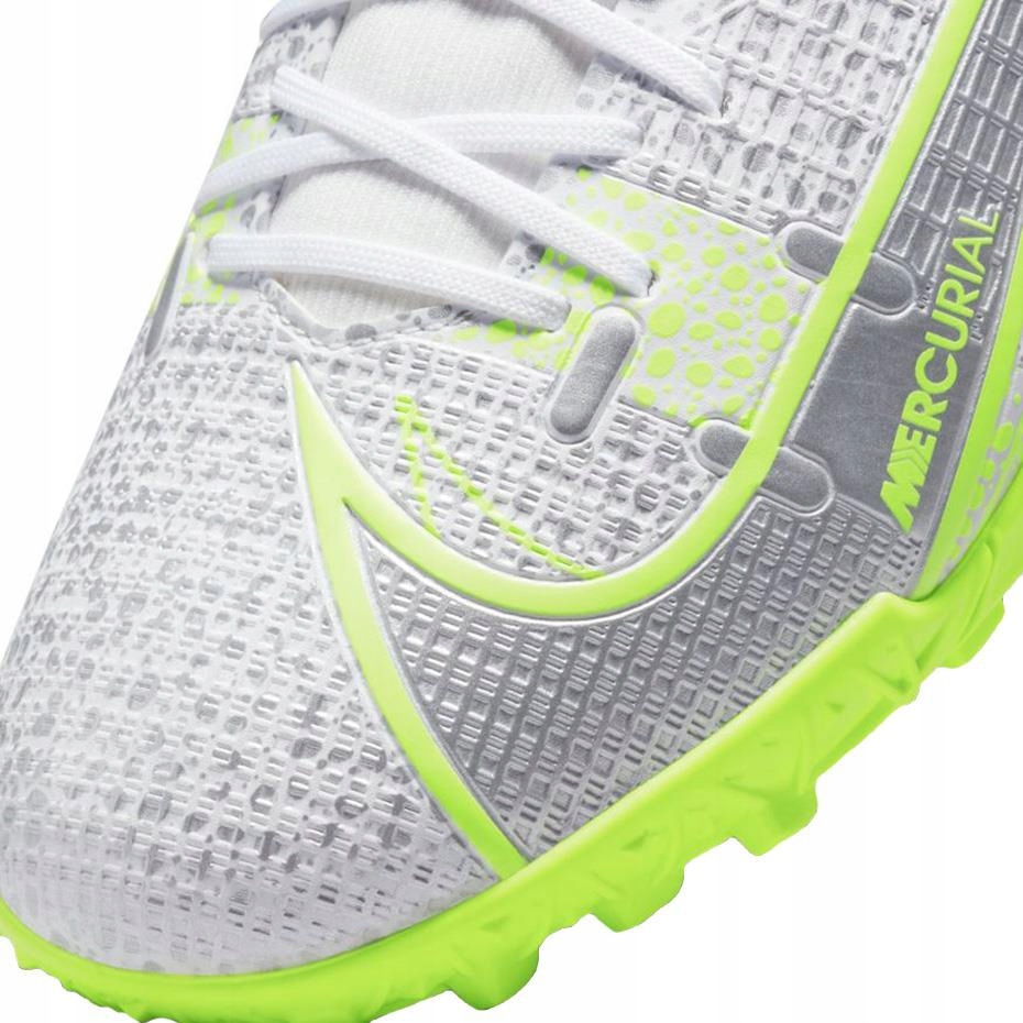 Ghetele de fotbal pentru bărbați Nike semi-amatori sunt concepute pentru a se juca pe suprafețe artificiale. Gazonuri Nike din colecția Mercurial Silver Safari. Partea superioară este realizată din microfibre mai groase pentru a crește suprafața de contact cu bila. Guler Dynamic Fit, adică „Șosete”, care este o stabilizare suplimentară pentru gleznă. Întărire în zona călcâiului. Talpa exterioară cu știfturi din cauciuc asigură aderență pe iarba artificială.
