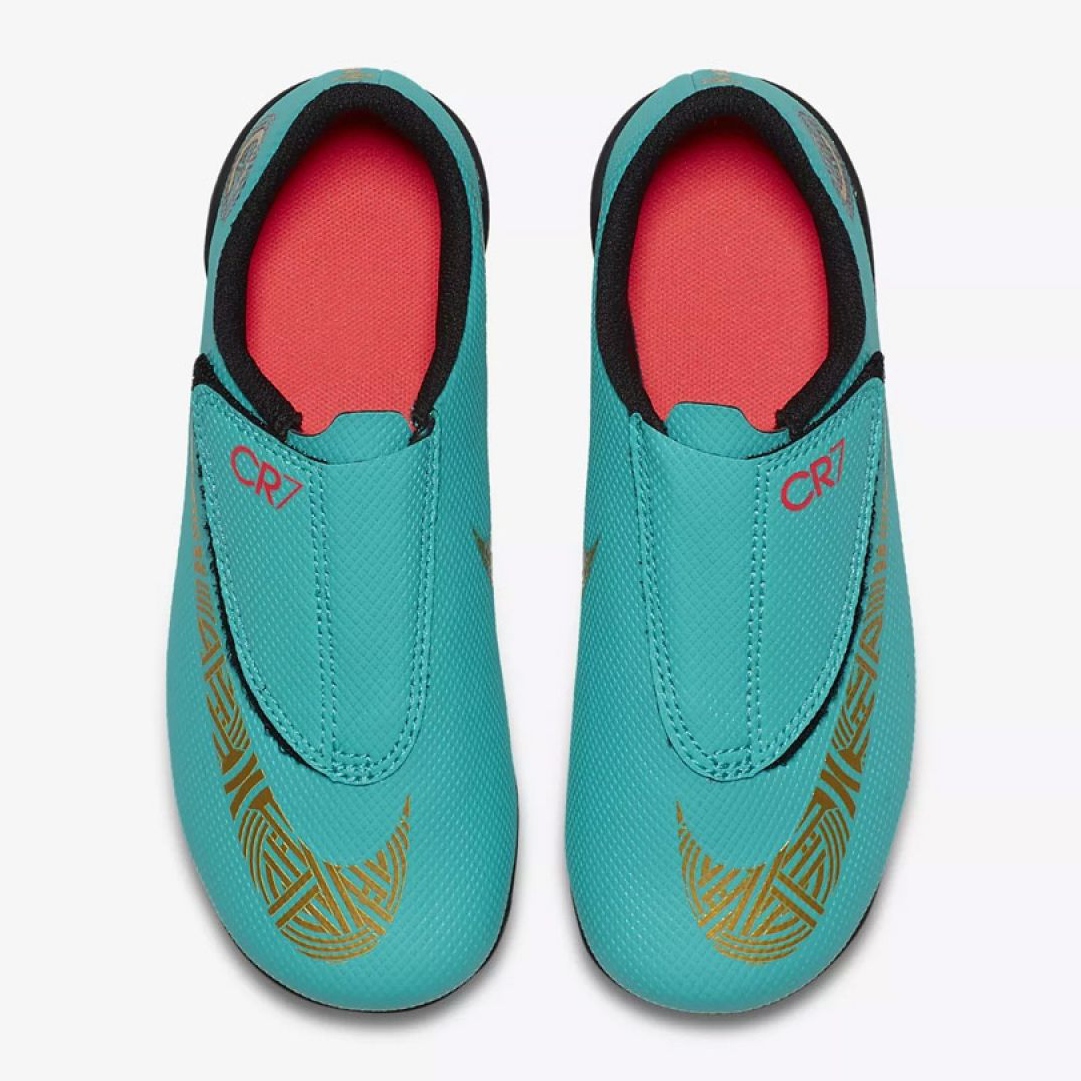 Pantofii de fotbal Nike Mercurial Vapor 12 Club Ps V CR7 Mg Jr AJ3096-390 sunt alegerea perfecta pentru tinerii pasionati de fotbal care doresc sa combine confortul si stilul pe teren. Se disting printr-o culoare albastru intens, completata cu accente turcoaz care cu siguranta vor atrage atentia.
