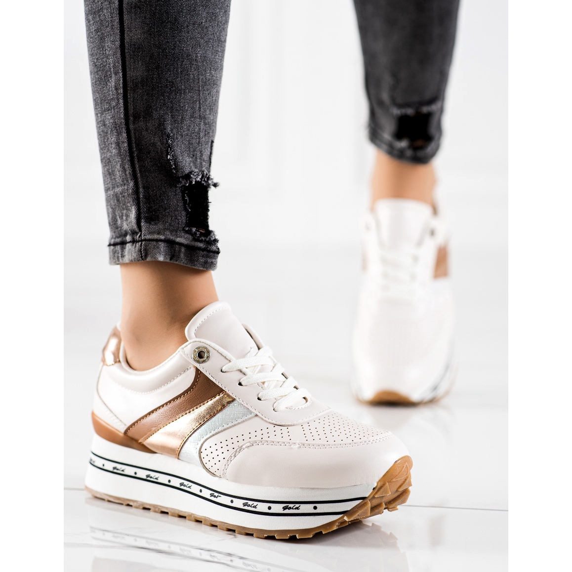 Descoperiți adidașii Fashion albi și aurii unici de la producătorul G2G/Good To Great, care vor deveni o completare perfectă pentru stilul dvs. de zi cu zi. Acești pantofi sport de damă combină designul și funcționalitatea la modă, perfecți atât pentru utilizarea de zi cu zi, cât și pentru persoanele care prețuiesc confortul și stilul.