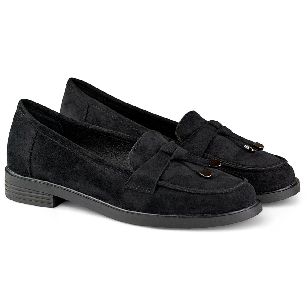 Partea superioară din piele de căprioară ecologică în negru le oferă stil, iar nasul rotund le face extrem de confortabile chiar și în timpul unei uzuri lungi. O talpă plată cu o înălțime de 2,5 cm garantează stabilitate și libertate de mișcare, ceea ce face ca acești pantofi să fie o alegere ideală atât zilnic, cât și pentru ocazii speciale.
