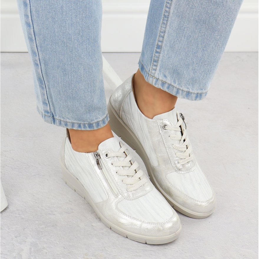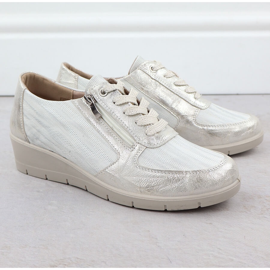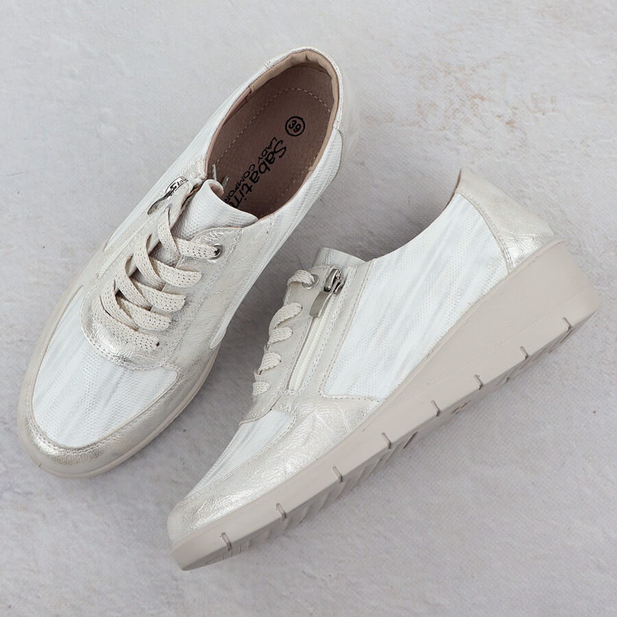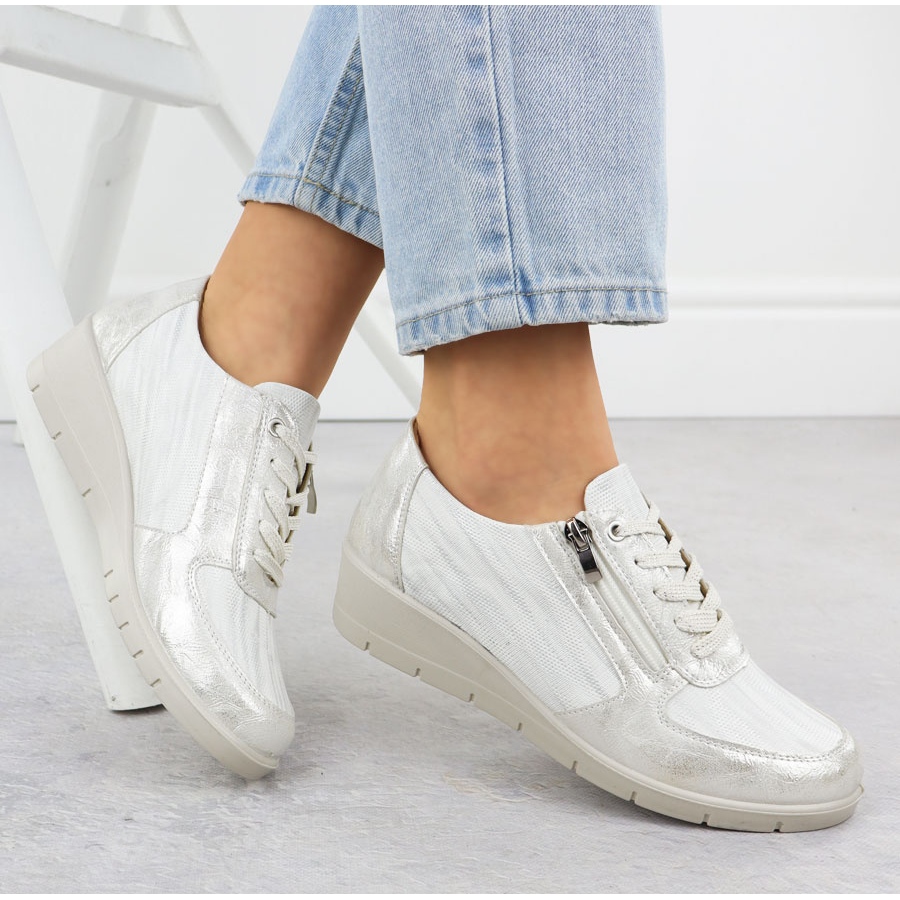 Descoperiți cea mai recentă propunere de la marca Sabatina - pantofi sport pe pană într -o culoare unică de argint. Modelul LH01 este o combinație perfectă de design modern și materiale de cea mai înaltă calitate. Acești pantofi vor completa perfect orice stilizare, adăugând strălucirea sa datorită finisajului metalic.