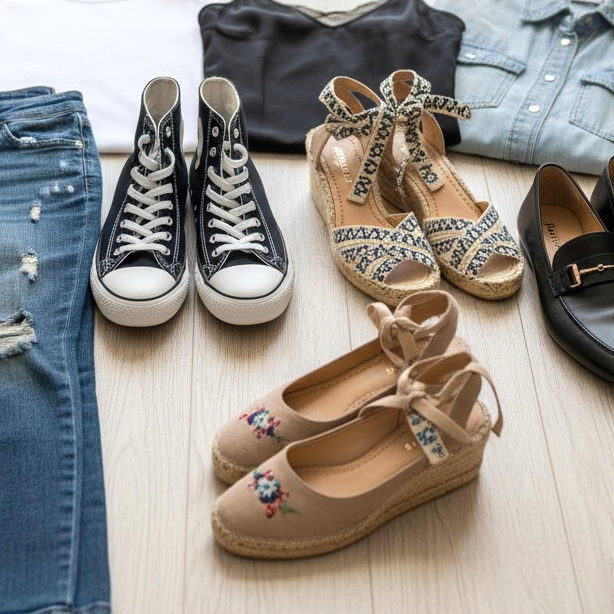 Primăvara și vara, puteți purta și sandale cu pană sau espadrile cu topul și pantalonii. Acești pantofi vor adăuga un caracter de vară ținutei tale și, în același timp, vor arăta la modă și stilat. Modelele cu cravate sau decorațiuni atrăgătoare vor funcționa deosebit de bine.