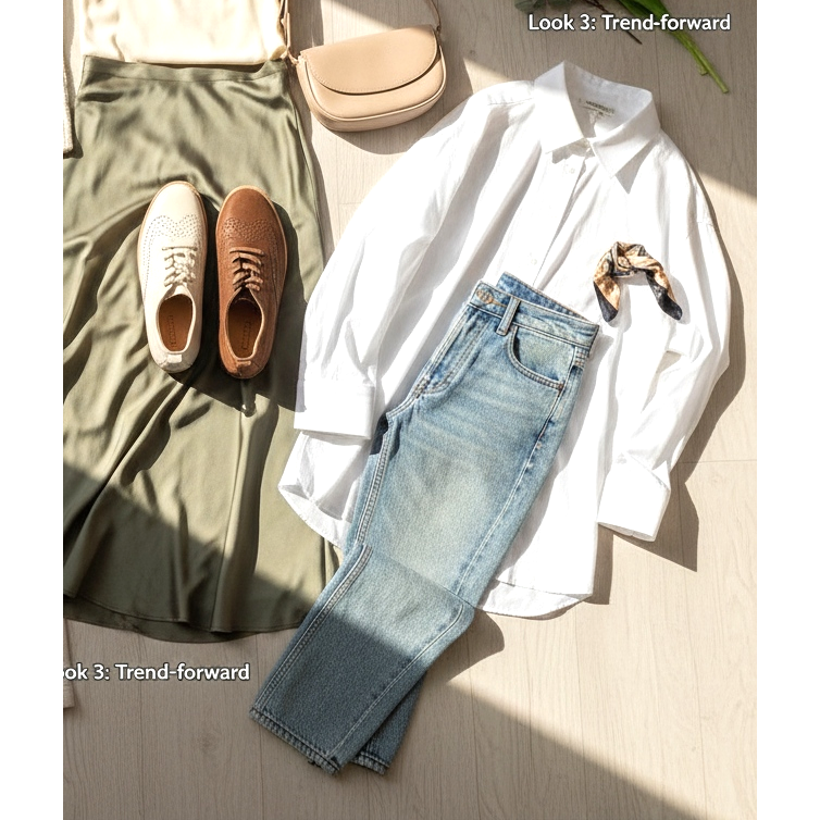 Aspectul 3 - Trend-forward: Derby moale crem + blugi vintage (ușor decolorați, în jurul taliei) + cămașă albă supradimensionată înfiptă în pantaloni. Efect parizian, nepretențios, elegant.