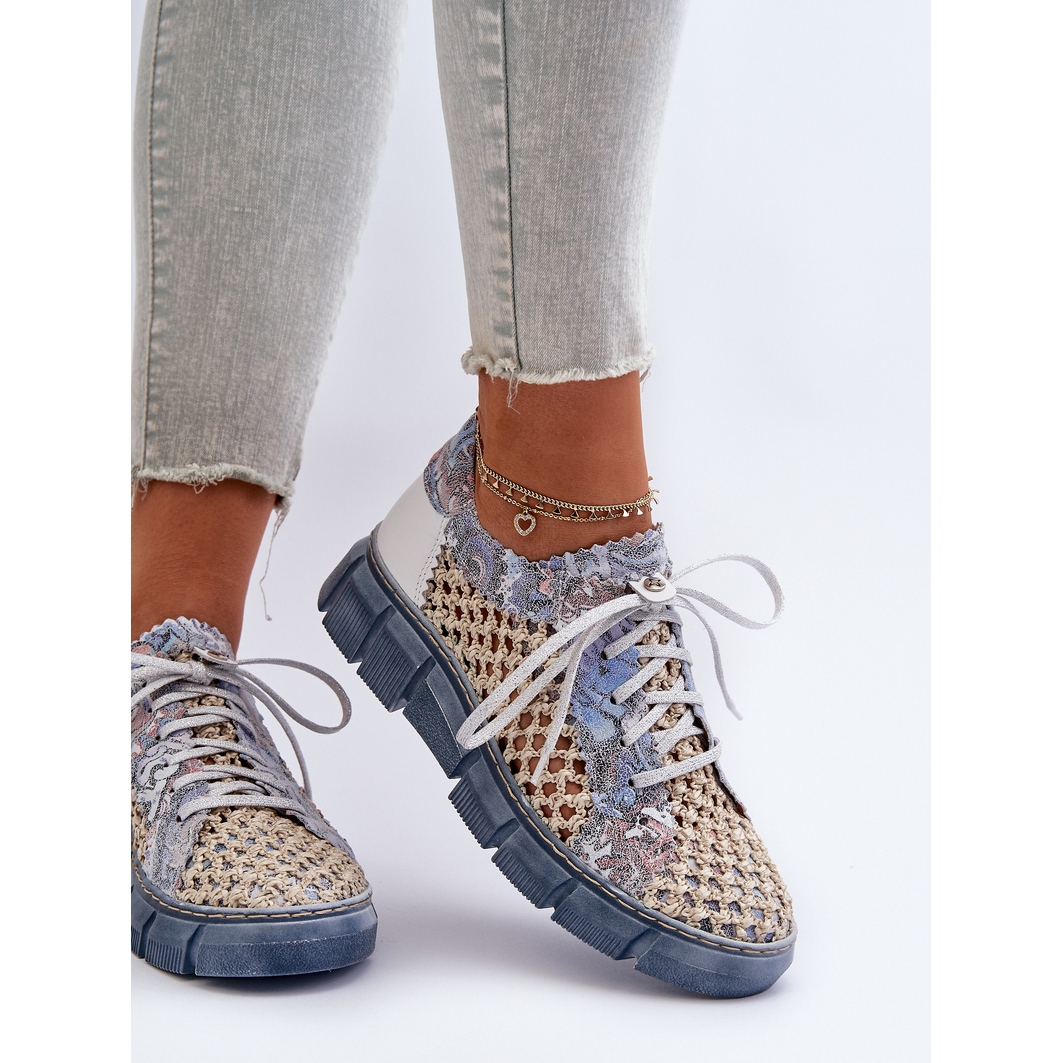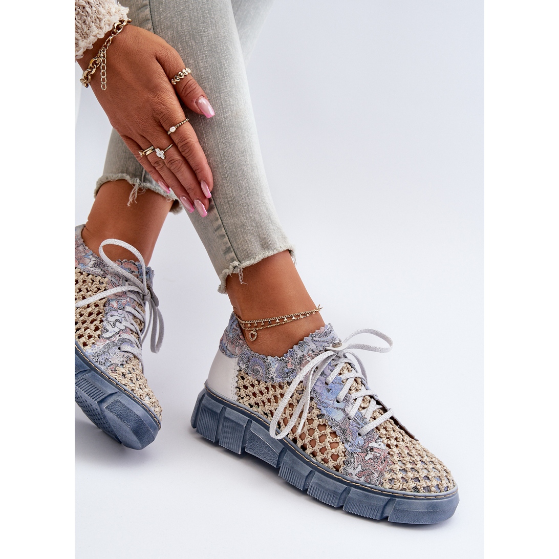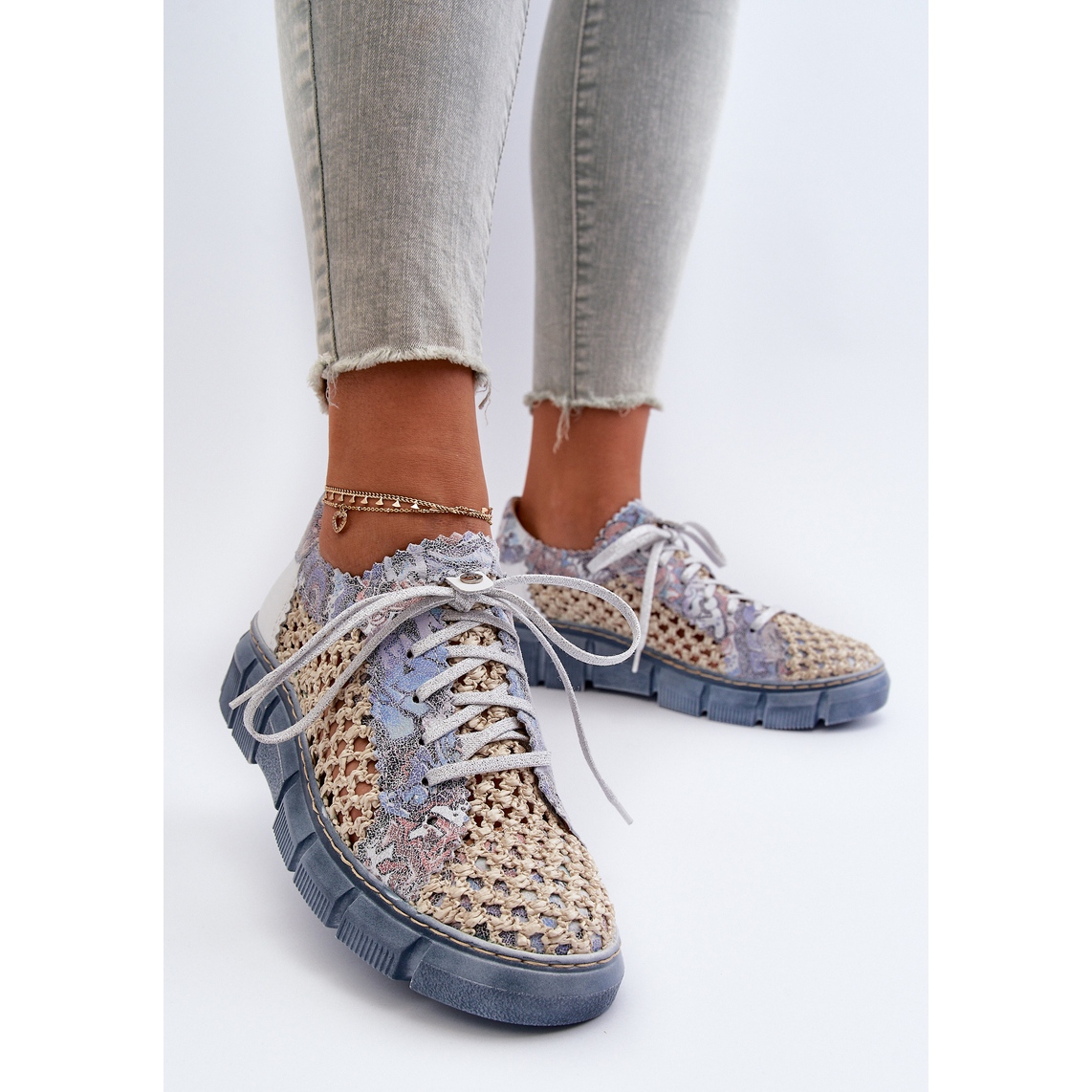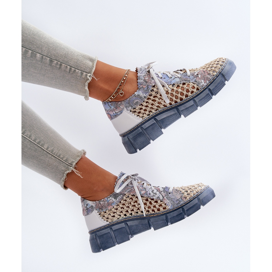 Înălțimea superioară de 7,5 cm și platforma de 3 cm grosime le face nu numai confortabile, ci și stilate. Modelul ajurat adaugă lejeritate și prospețime. Modelul este disponibil într-o combinație frumoasă de culori albastru și bej, care se potrivește perfect tendințelor actuale.