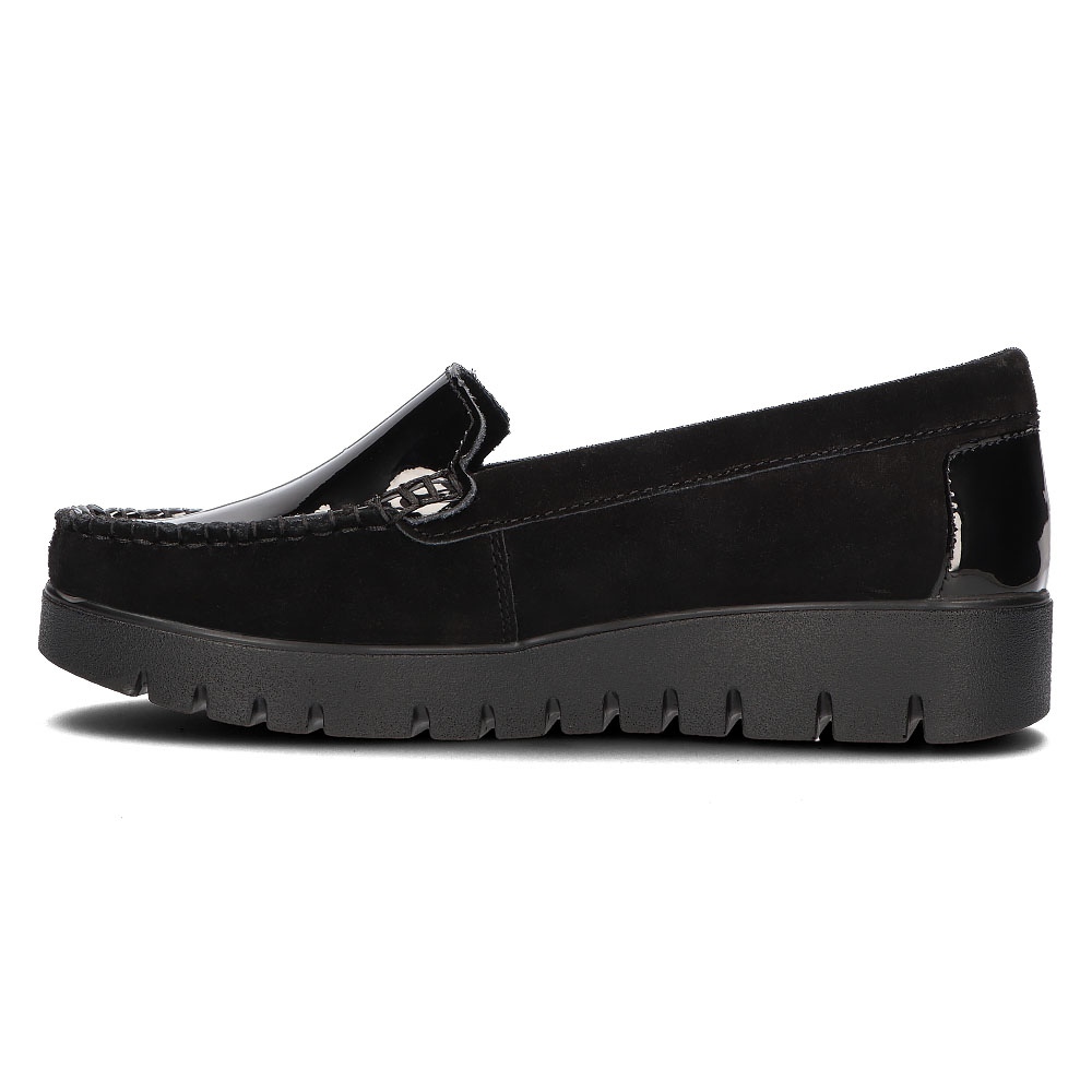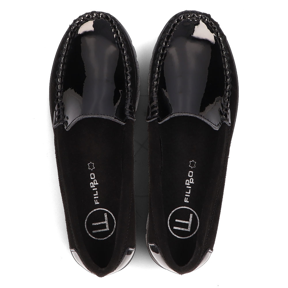 Finisajul negru, lacuit, le face cochete, iar varful rotund le face extrem de universale. Designul lor slip-on este o soluție practică care permite îmbrăcarea și scoaterea rapidă. Un toc scăzut de 3,5 cm, combinat cu o platformă de 2 cm, asigură stabilitate și confort chiar și în timpul unei zile lungi în mișcare.