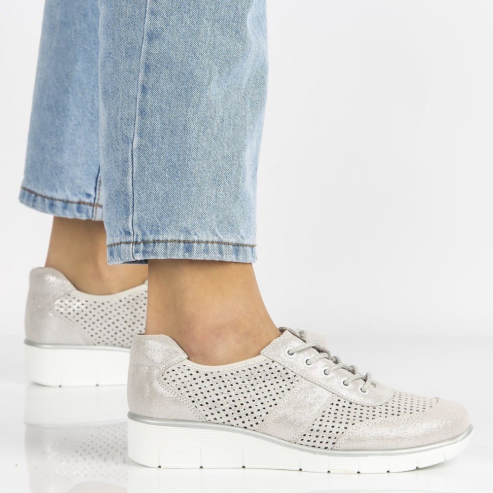 Talpa din plastic impresionează prin lejeritatea excepțională, ceea ce face din acești pantofi o soluție ideală pentru plimbările zilnice sau ieșirile cu prietenii. Înălțimea superioară de 6 cm adaugă o eleganță subtilă, iar culoarea albă a tălpii contrastează frumos cu finisajul decorativ argintiu.