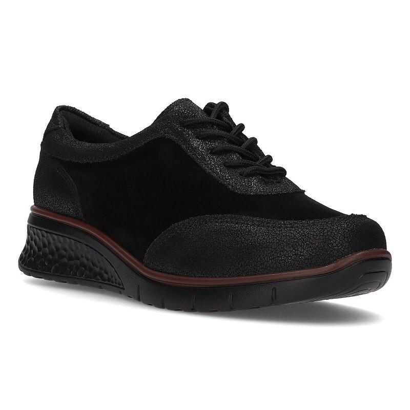 Modelul DP1509/20 BK se caracterizează printr-un vârf rotund și o închidere cu șireturi, care facilitează adaptarea la picior. Interiorul pantofului este căptușit cu material, iar branțul din piele ecologică asigură o ventilație adecvată, ceea ce este important atunci când este purtat pe perioade lungi de timp.