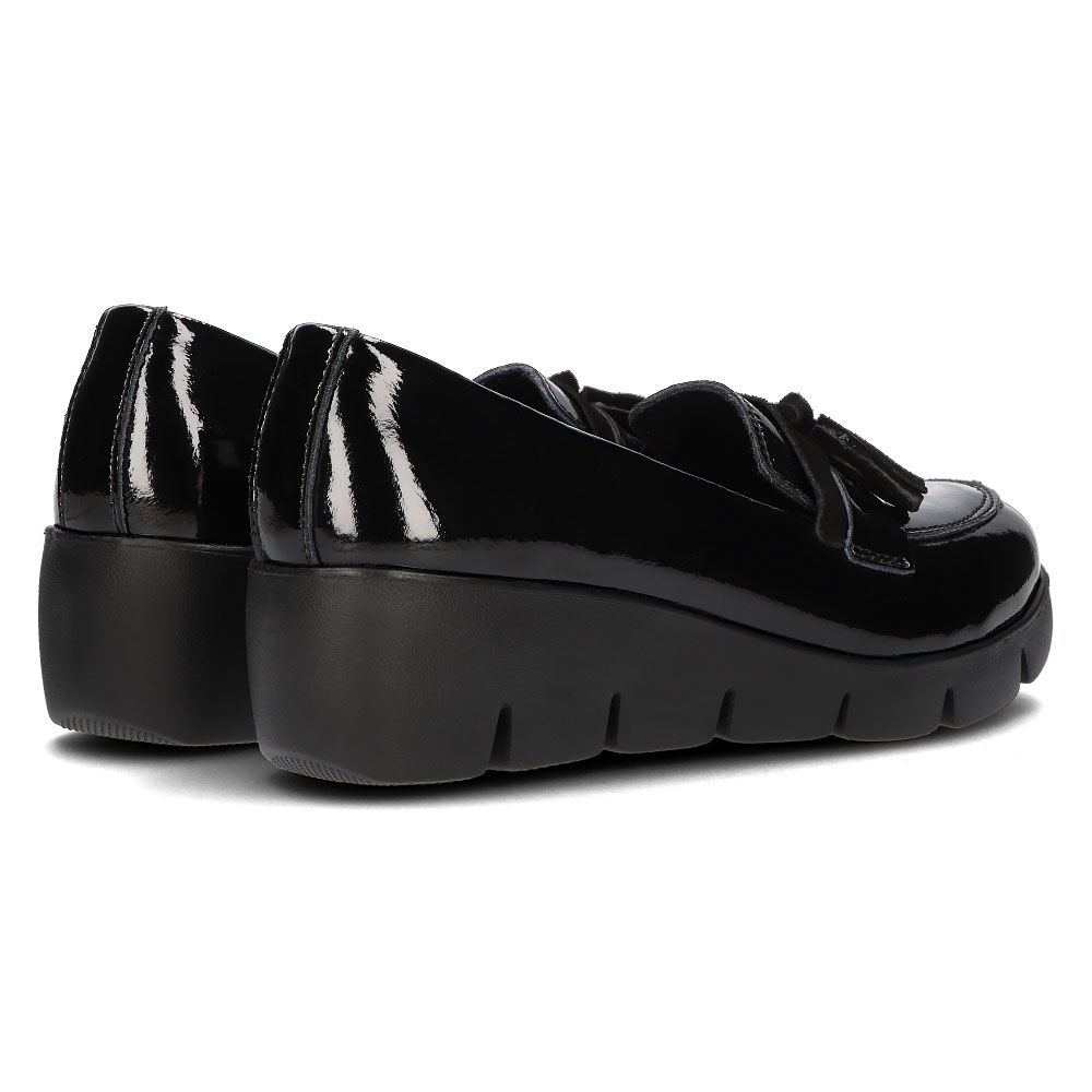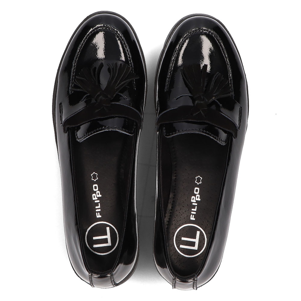 Pantofii negri Filippo DP3162/22 sunt decorati cu franjuri delicati si un finisaj lacuit, care le confera un caracter unic. Căptușeala confortabilă din material textil și branțul din piele asigură confortul la purtare pe tot parcursul zilei.