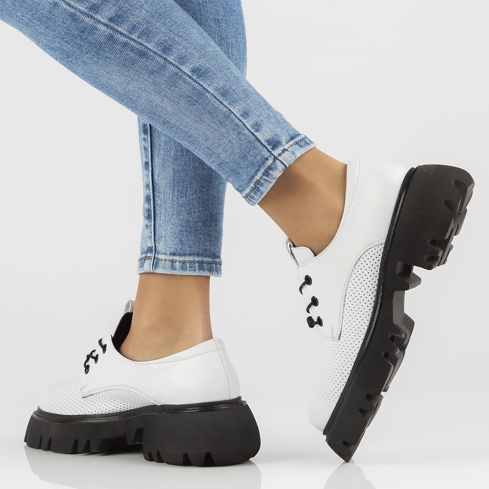 Realizate din piele naturala de inalta calitate, atat la exterior cat si la interior, asigura durabilitate si confort atunci cand sunt purtate. Căptușeala și branțul din piele garantează o ventilație adecvată și confort pe tot parcursul zilei. Talpa din plastic este ușoară și flexibilă, ceea ce sporește în plus confortul de utilizare, iar înălțimea platformei de 4 cm și înălțimea tocului de până la 6,5 cm le oferă un aspect modern, la modă.