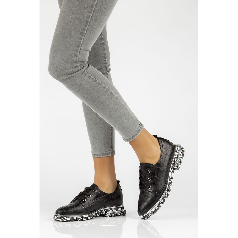 Pantofii se caracterizează printr-un vârf rotund și o formă de migdale, care le adaugă o eleganță subtilă. Închiderea cu dantelă permite o potrivire perfectă pe picior, iar înălțimea superioară de 7 cm le face foarte universale. Talpa este realizată din plastic de înaltă calitate, cu o înălțime a platformei de 4 cm, garantând stabilitate și confort de zi cu zi.