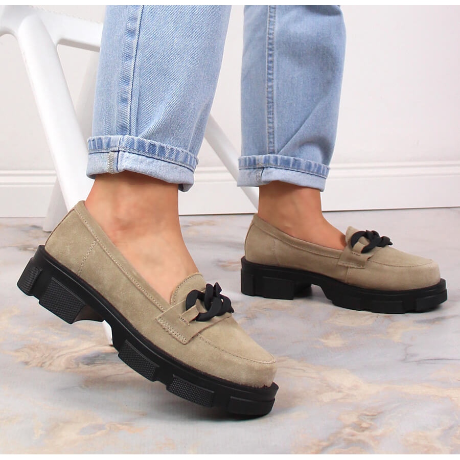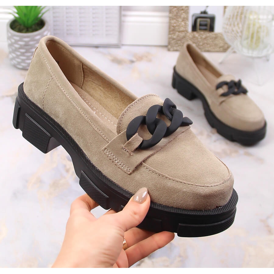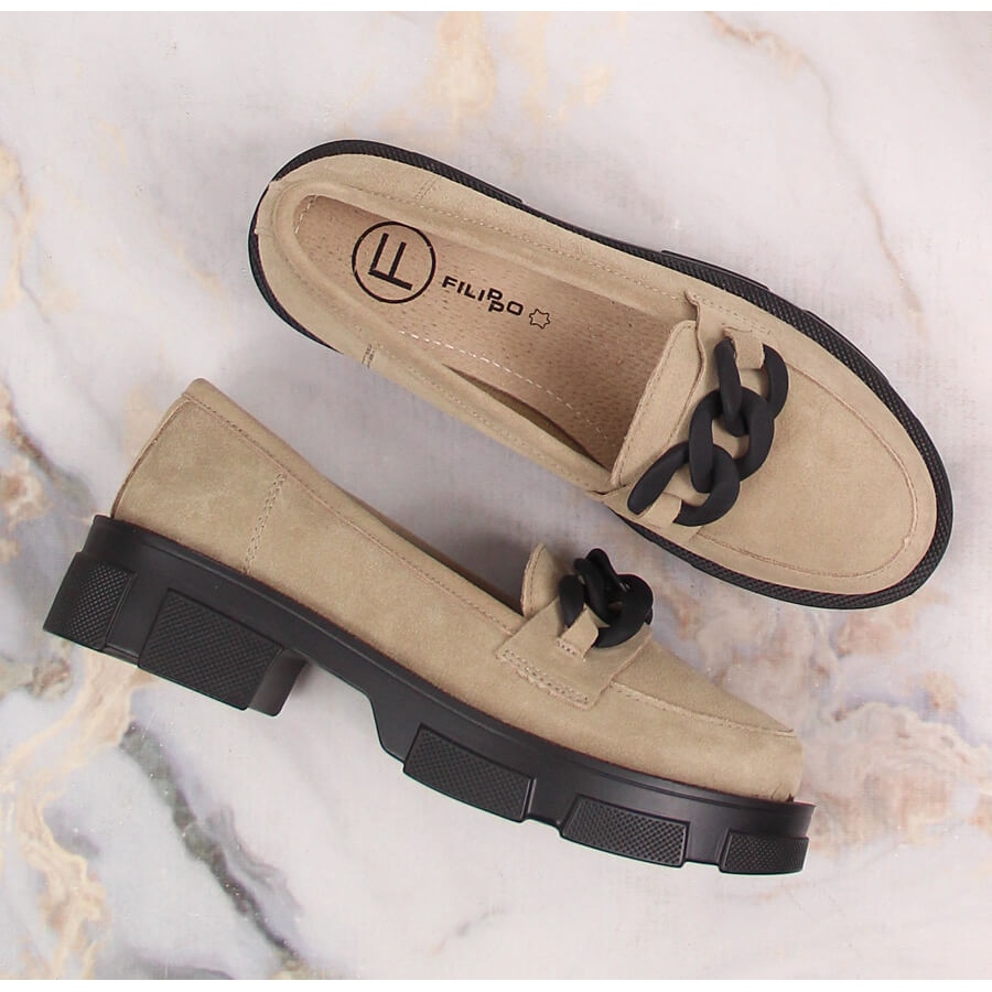 Pantofi eleganți și confortabili pentru femei Filippo DP3221/23 într -o nuanță la modă, bej. Fabricat din piele naturală din piele de căprioară, decorată cu un lanț eficient - ideal pentru stilizări de zi cu zi și mai multe producții pentru primăvară și toamnă.