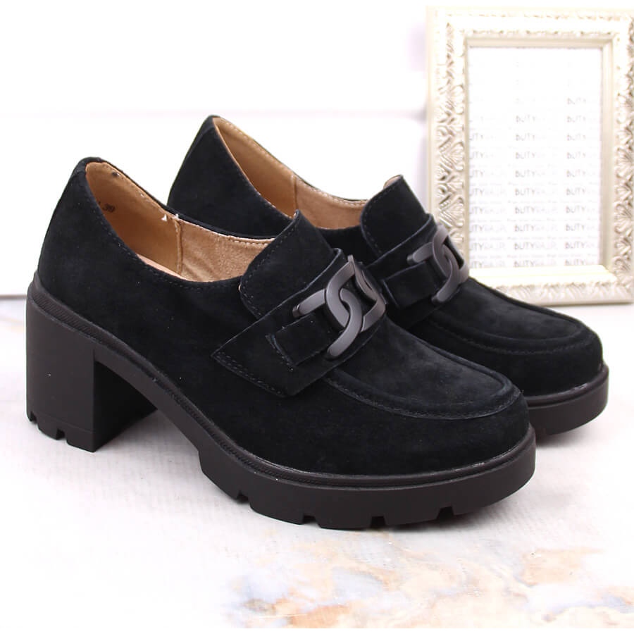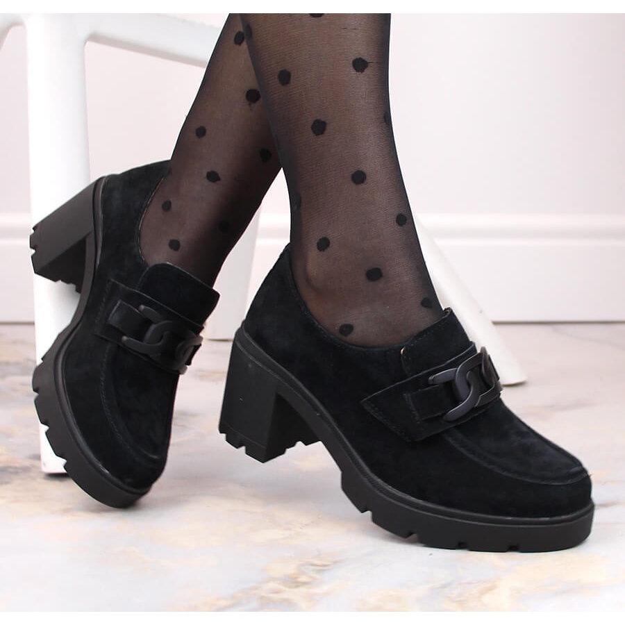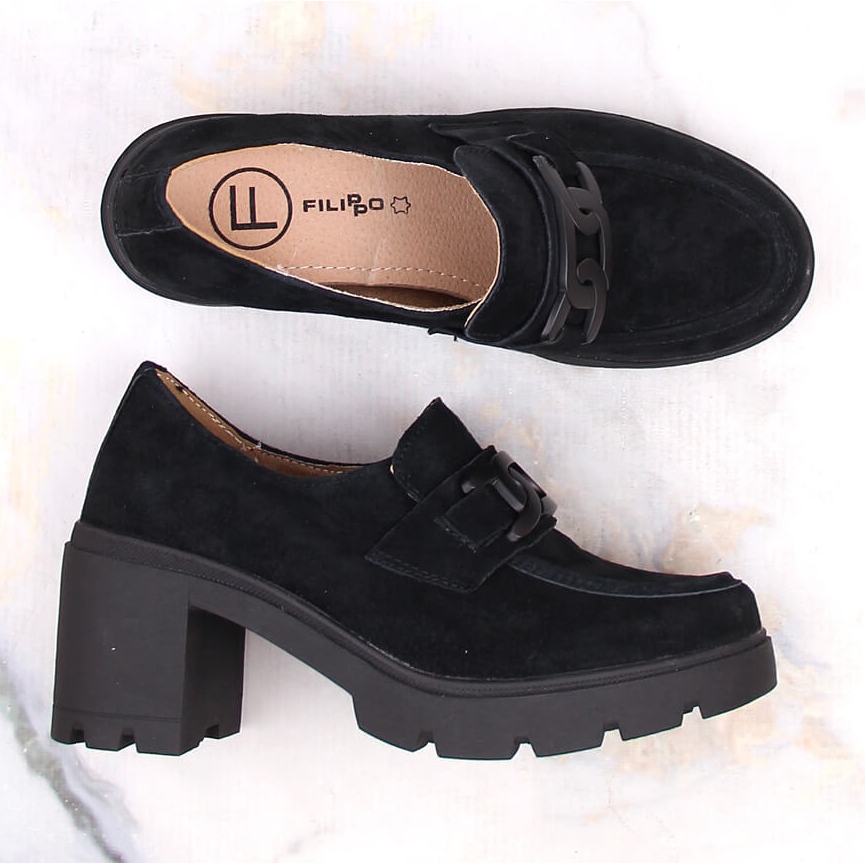 Produsul numit „Pantofi din piele intoarsa, mocasini pe toc inalt si platforma, negru Filippo DP4785” sunt mocasini negri de dama produsi de marca Buty Filippo. Sunt confectionate din piele naturala exterioara. Partea interioară a pantofului are căptușeală din material textil și branț din piele naturală. Mocasinii de dama au marimi standard.