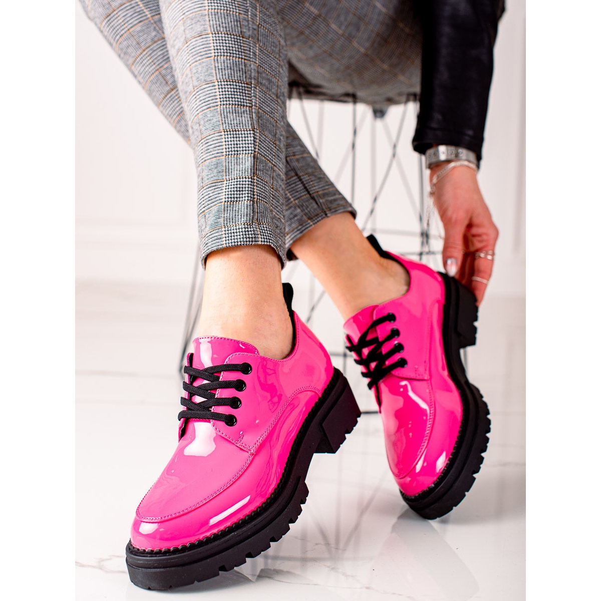 Culoarea fucsia face ca acești pantofi să iasă în evidență printre alte modele, iar talpa neagră le adaugă caracter. Degetul rotund și tocul moale încorporat asigură confort, chiar și atunci când este purtat pentru perioade lungi de timp. Datorită unei platforme înalte de 3 cm și unui toc de 4,5 cm, pantofii nu numai că arată frumos, dar și subliniază în mod optim silueta.
