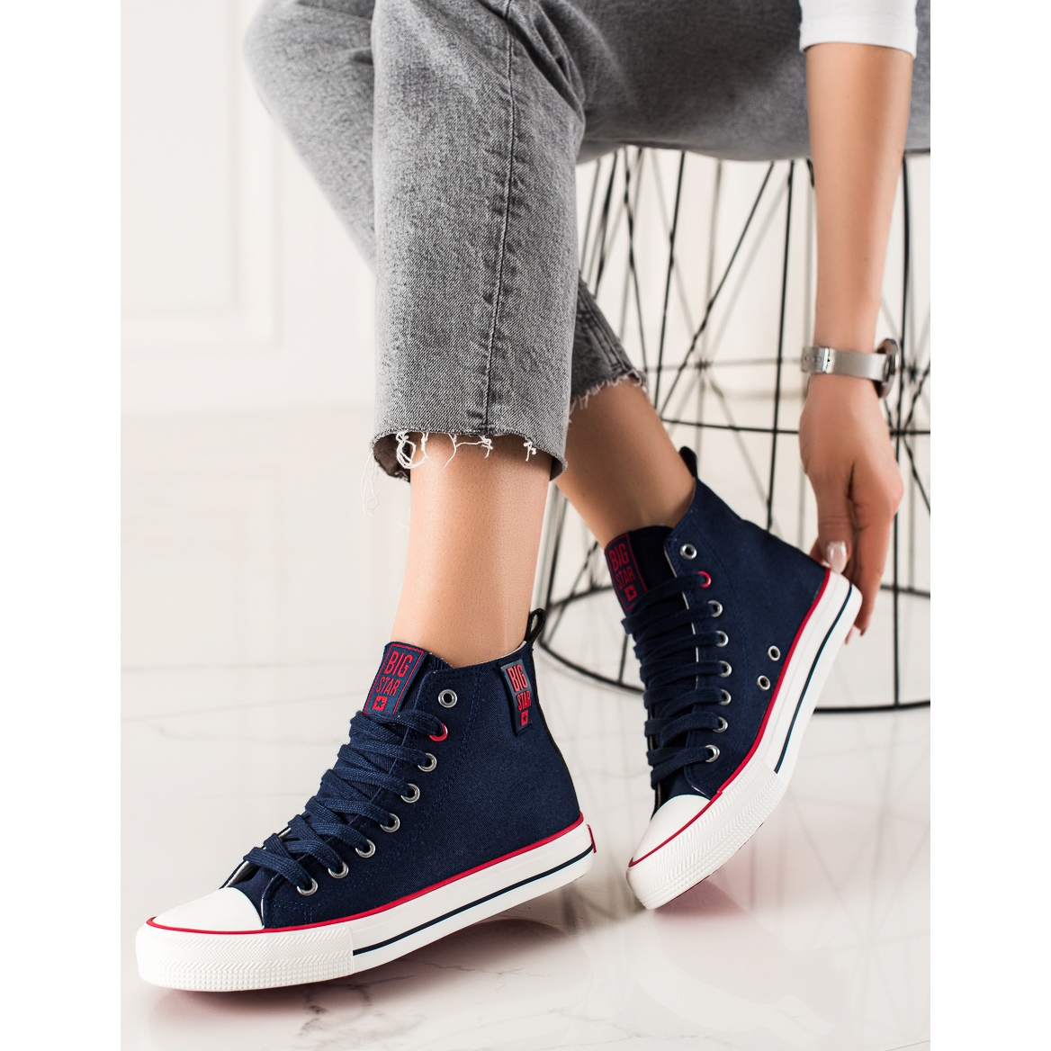 Adidașii înalți Big Star JJ274125 în bleumarin sunt o alegere perfectă pentru femeile care apreciază confortul și un aspect la modă. Acești pantofi eleganti se potrivesc perfect într-un stil sportiv și casual, făcându-i partenerul perfect de zi cu zi. Realizate 100% din material textil, sunt usoare, aerisite si se potrivesc perfect piciorului.