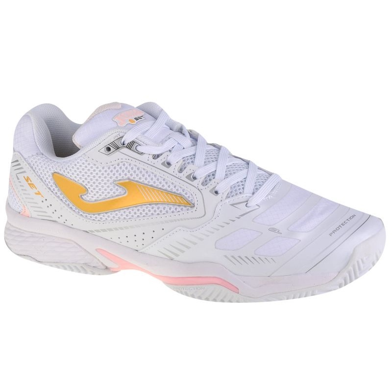 Pantofi Joma T.Set Lady 2202 în TSELS2202P - încălțăminte de tenis alb scăzut pentru femei, create pentru joc pe terenurile de pământ. Acestea combină un aspect elegant cu funcționalitatea necesară în timpul frazelor rapide și antrenamentelor lungi.