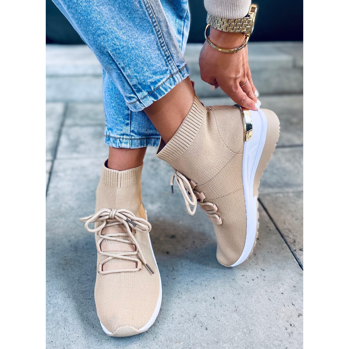 Descoperă o nouă definiție a stilului urban cu pantofii sport șosete Katrin Khaki într-o nuanță de bej elegant – o soluție extrem de la modă și universală, adaptată nevoilor femeilor. Aceștia sunt pantofi sport înalți, de tip tenisi, care funcționează la fel de bine atât în timpul activității fizice, cât și în timpul utilizării de zi cu zi.