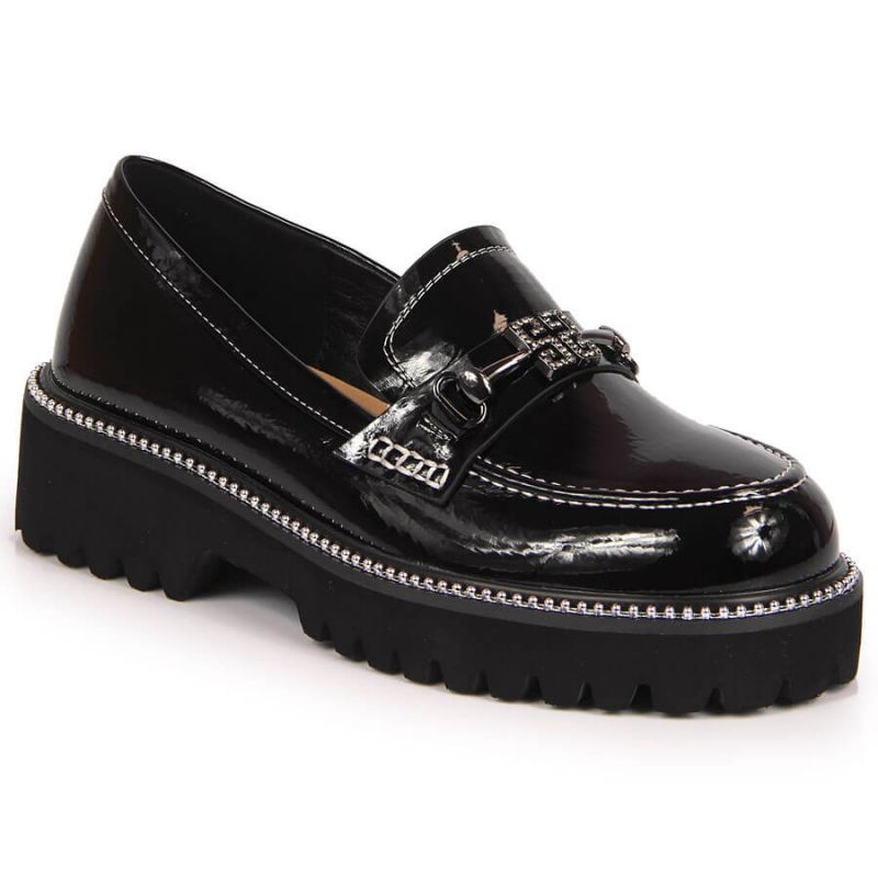 Pantofii se caracterizeaza printr-un model joasa, ceea ce ii face perfecti pentru multe stiluri. Fabricate din piele ecologică de înaltă calitate, acestea oferă nu doar un aspect atractiv, ci și durabilitate. Partea superioară lăcuită le conferă o strălucire caracteristică care atrage atenția. Nasul rotund adauga subtilitate, iar strasurile ca element decorativ suplimentar introduc o nota de originalitate.