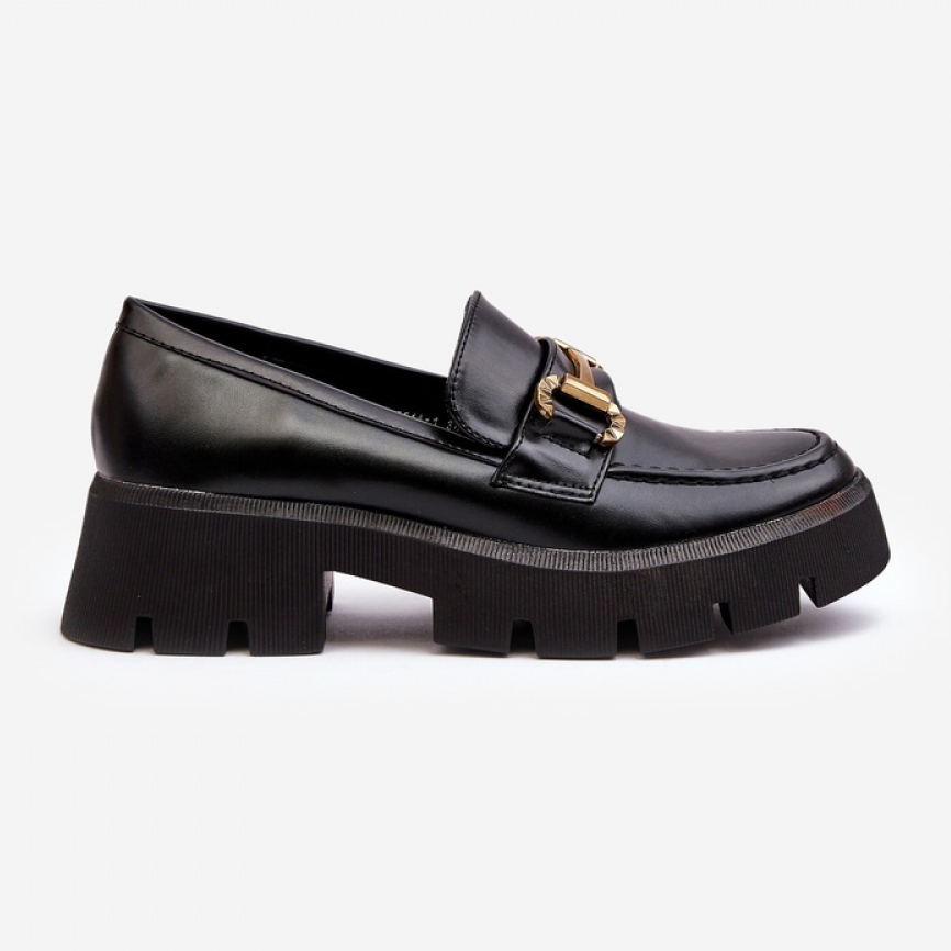 Pantofi de dama din piele ecologica. Asezat pe un toc plat masiv si o platforma groasa. Există un decor auriu pe cureaua din față. Un branț moale din piele ecologică asigură confort în timpul utilizării. Arată grozav atât cu pantaloni, cât și cu o fustă.