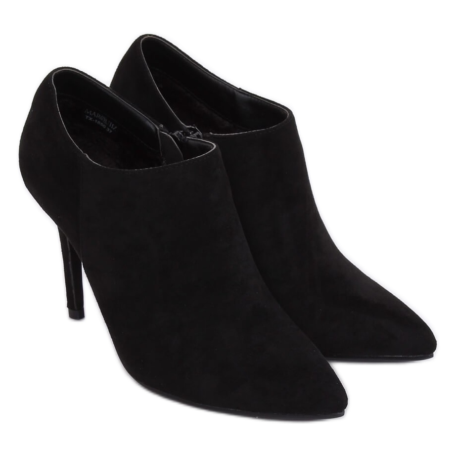 Pantofii cu toc din piele intoarsa neagra TX-1850 Black sunt alegerea perfecta pentru femeile care apreciaza eleganta si confort. Confectionate din piele intoarsa ecologica, aceste frumoase botine imbina stilul clasic si modern. Designul modelat, cu un vârf ascuțit delicat și un stiletto subțire de 10,5 cm înălțime le fac să sublinieze perfect silueta, adăugând lejeritate și slăbire.