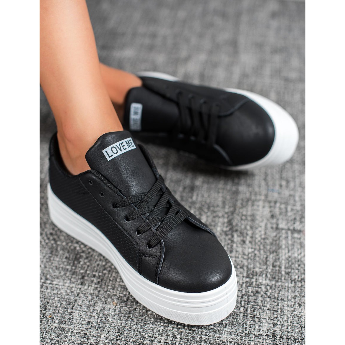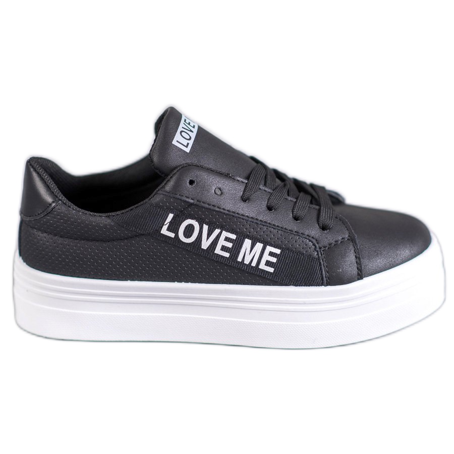 Partea superioară realizată din material negru de înaltă calitate se remarcă prin aspectul său elegant, în timp ce talpa albă din plastic cu benzi de rulare nu numai că adaugă caracter, ci asigură și aderență și stabilitate excelentă pe diferite suprafețe. Detalii precum inscripțiile albe „LOVE ME” pe lateral și pe limbă adaugă o notă de originalitate aspectului clasic al pantofilor.