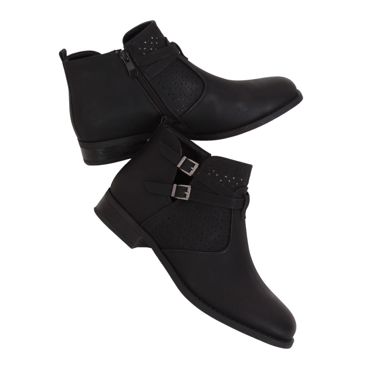 Pantofii sunt disponibili într-o culoare clasică neagră, ceea ce îi face ușor de asortat oricărei ținute. Elemente suplimentare, cum ar fi decupaje ajurate și strasuri, adaugă un aspect modern pantofilor.