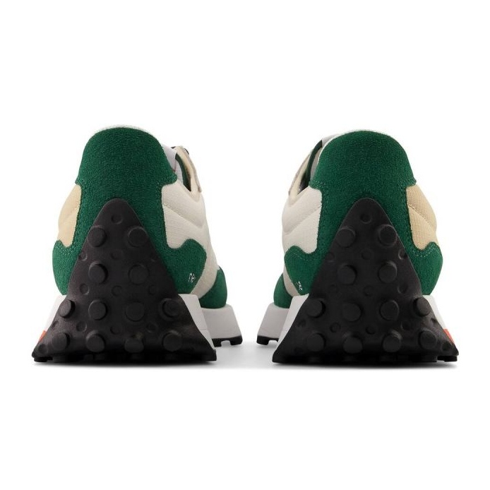 Elementul vizual dominant este litera laterală N mărită, marca comercială New Balance, care este expusă în aceste modele pentru a sublinia estetica retro-modernă a pantofilor din seria 327. Aceasta este o caracteristică care evidențiază unicitatea și autenticitatea mărcii.