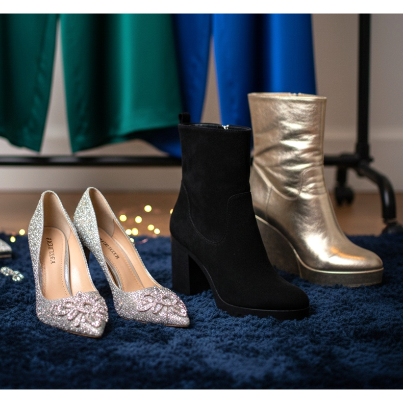 Soluția perfectă va fi tocuri înalte în culori discrete pe care le poți asorta cu restul ținutei tale. Dacă mergi la o petrecere de seară, poți alege modele cu decorațiuni atrăgătoare – de exemplu, cu cristale sau accente metalice.