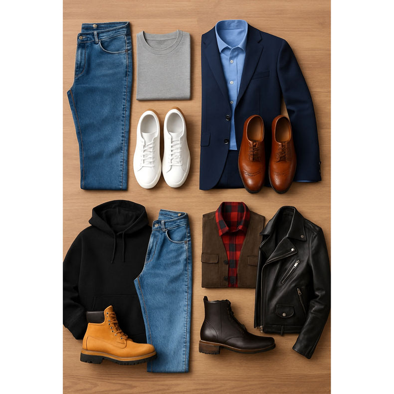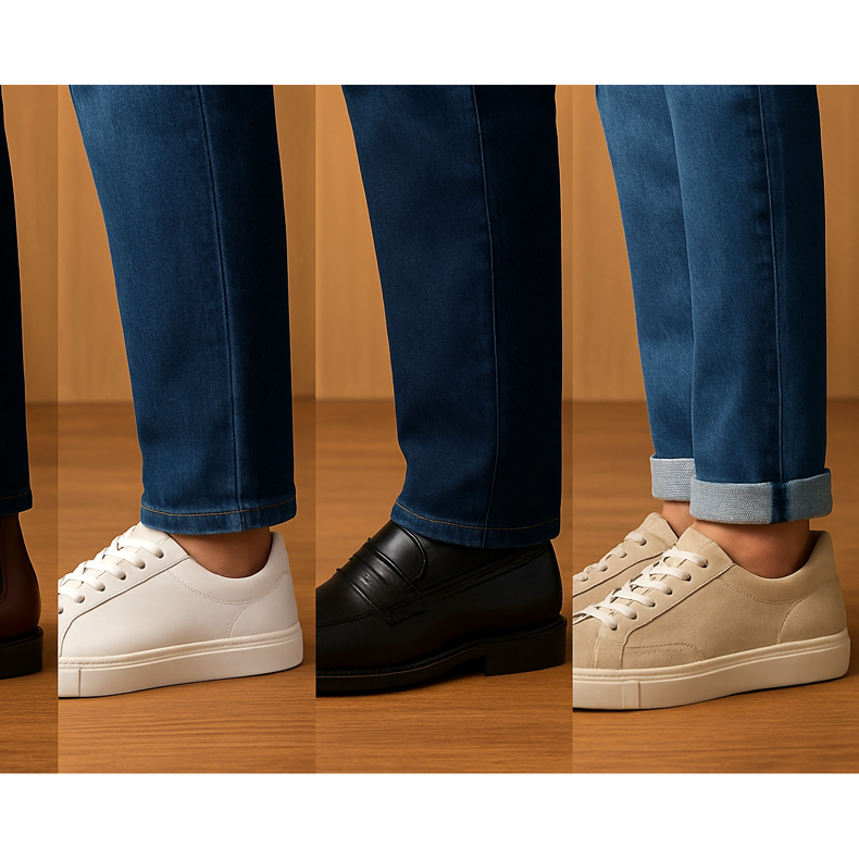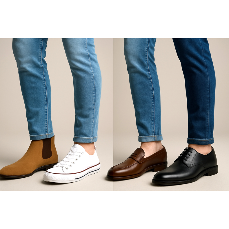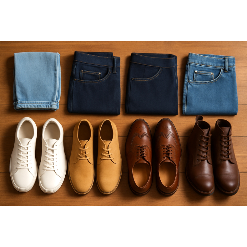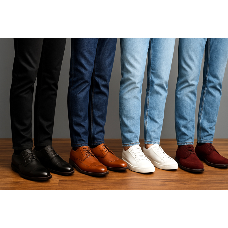 Un ghid complet pentru selectarea pantofilor pentru bărbați pentru diverse stiluri de blugi. Învață regulile de styling de la slim fit la baggy și descoperă combinațiile perfecte.
