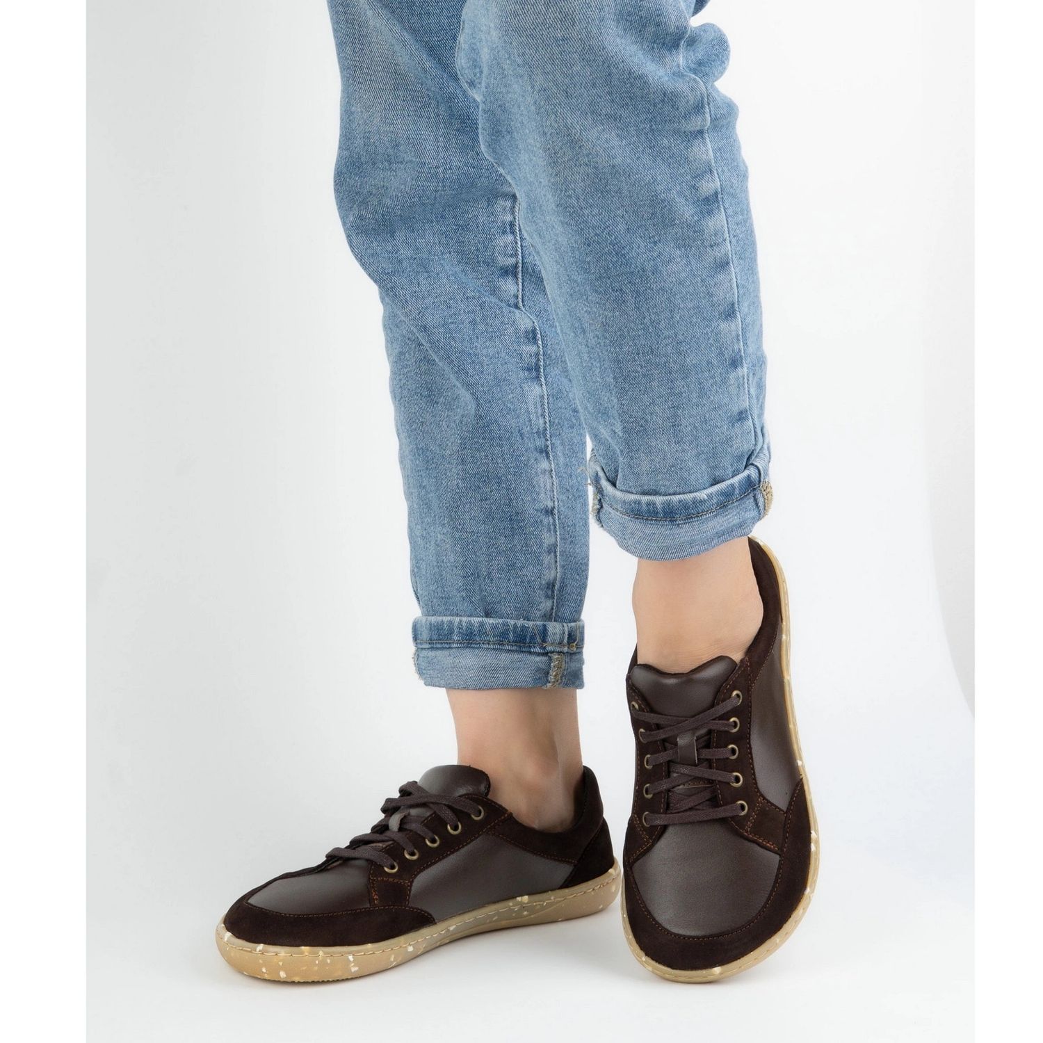 Partea superioară din piele înfășoară ușor piciorul, iar structura minimalistă atentă permite picioarelor tale să funcționeze în armonie cu forma lor naturală. Talpa plată desculță asigură libertatea de mișcare și împiedică oboseala chiar și în timpul uzurii întregi. Datorită frontului mai larg, degetele au spațiul potrivit, ceea ce crește confortul utilizării.