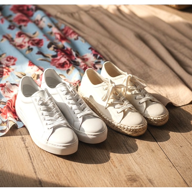 Pentru o rochie maxi mai minimalistă din in sau bumbac, adidașii ultra-subțiri sau adidașii clasici de pânză creează un look casual, de vară. Pentru un festival, o piață sau o plimbare prin oraș - această combinație este atât confortabilă, cât și elegantă. Alege adidași în culori neutre (alb, crem, bej) care să nu se ciocnească de modelul rochiei.