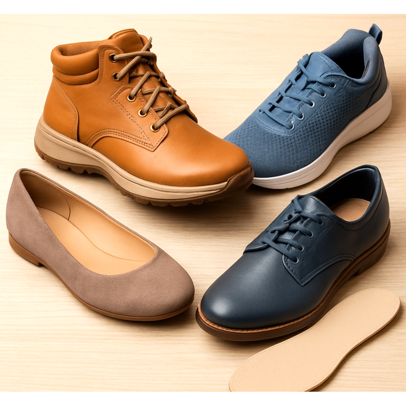Piciorul are o arc înalt - aveți nevoie de pantofi cu suport bun pentru arc și un ax mai înalt. Evitați inserțiile plate. Căutați mărci ortopedice (Vionic, Ecco).
