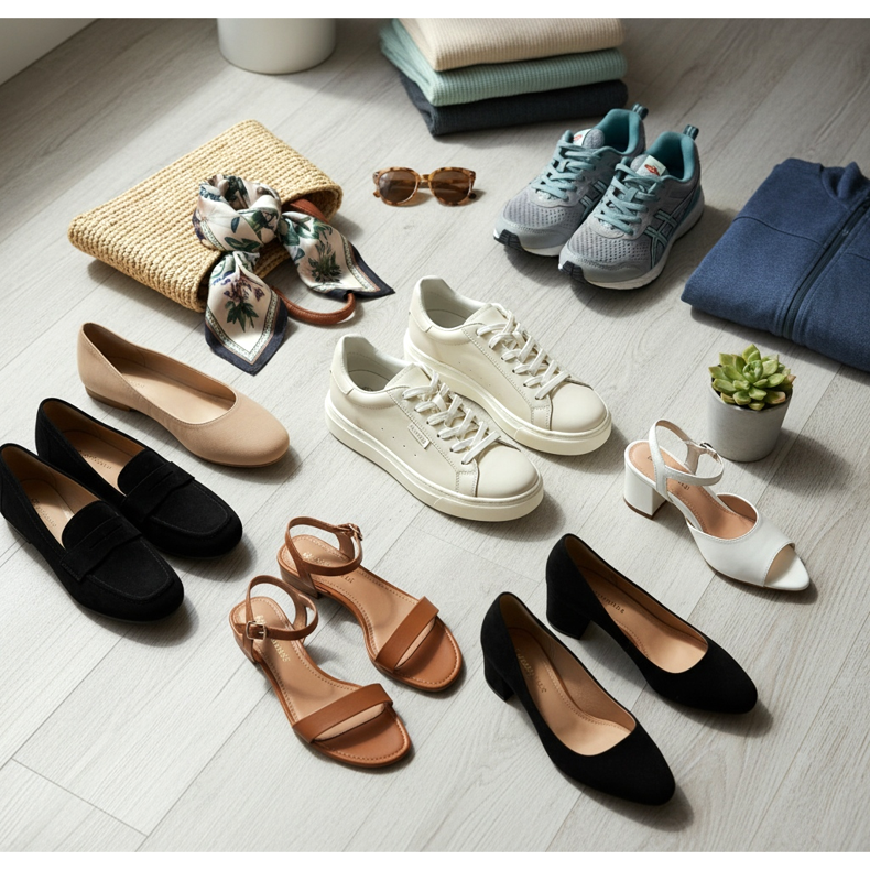 În al treilea rând – sandale confortabile pentru zilele mai calde. Alege un model cu talpa plata intr-o nuanta naturala a pielii. În al patrulea rând - tocuri înalte pentru ieșirile de seară. Pompele clasice cu toc sau mulașii eleganti vor funcționa perfect.