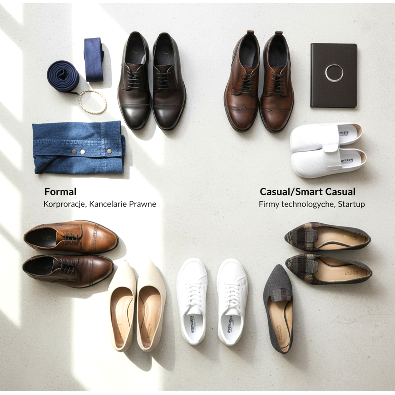 Companiile de tehnologie, agențiile creative și startup-urile au adesea un cod vestimentar relaxat. Îți poți permite brogues, mocasini și chiar adidași eleganti. Doamnele pot purta balerini, lord sau pantofi plati. Curățenia și aspectul bine îngrijit sunt importante, nu neapărat formalitatea.