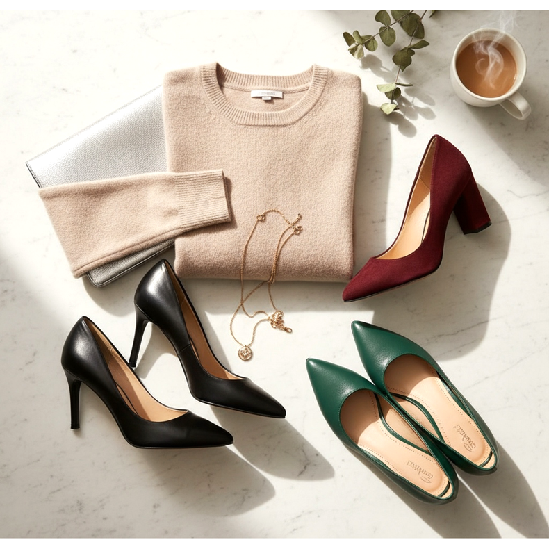 Pompele clasice se potrivesc perfect cu un pulover în culori discrete - gri, negru, bej. Poti alege atat modele cu toc inalt, cat si pe cele cu toc confortabil, care iti va asigura confort atunci cand stai in picioare sau mergi mult timp. Tocurile înalte negre sau bej sunt o alegere dovedită care arată întotdeauna elegant.
