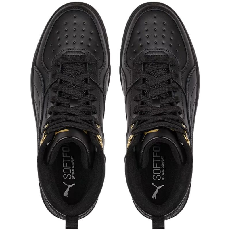 Acestia fac parte din categoria de pantofi sport Puma pentru dama. Rebound Rugged sunt pantofi înalți de exterior, de culoare neagră, decorați cu detalii aurii. Plasturele producătorului se află pe partea laterală a pantofului.