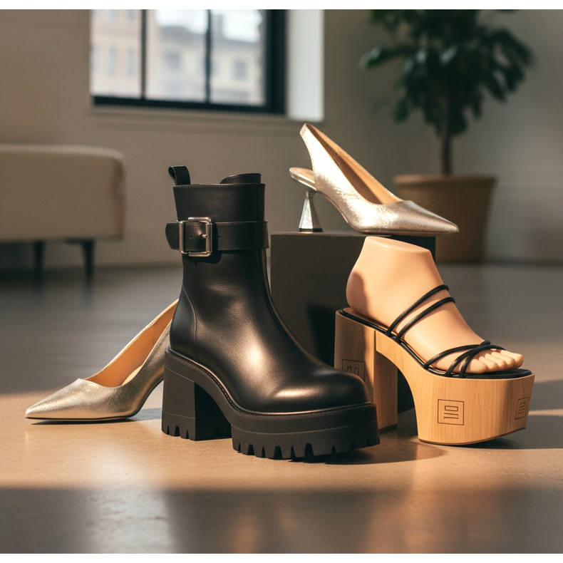 Primii pe lista pantofilor care se întorc sunt platformele cu un vârf întărit și o talpă masivă. În anii 2000 inițiali, acestea erau cel mai adesea negre sau argintii, cu o cataramă metalică sau o talpă agresivă. Varianta modernă este mai echilibrată: aceeași masivitate, dar materiale mai elegante și un stil mai puțin strălucitor.