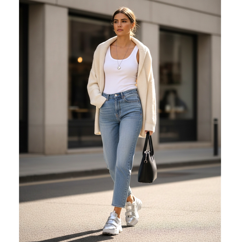 Pantofii metalici - argintiu și auriu - sunt a treia categorie. Botine argintii, mule aurii, slingback metalici - sunt pantofi care în 2026 nu mai sunt rezervați exclusiv petrecerilor și nunților. Se poartă cu stilul de zi cu zi cu denim sau lenjerie intimă cu un nou sens.