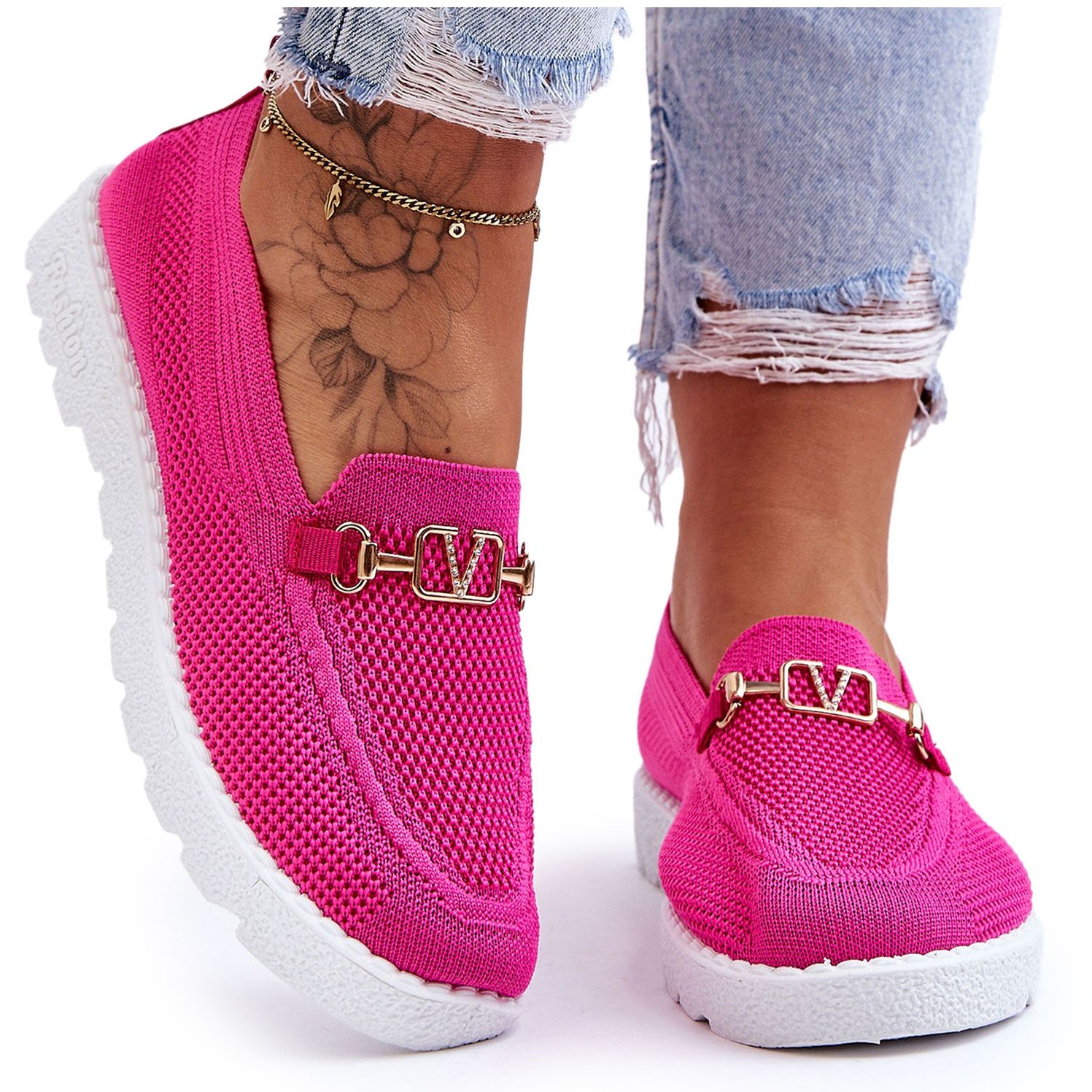 Adidași eleganți și confortabili, care vor funcționa în fiecare zi - pentru muncă, cumpărături sau întâlniri cu prietenii. Partea superioară din fața gleznei din țesătură moale într -o nuanță de roz (piersică/fuksia) decorată pe față cu o aplicație de aur cu strasuri imitând strasuri. Structura introdusă și o platformă plană asigură confortul și ușurința de utilizare.