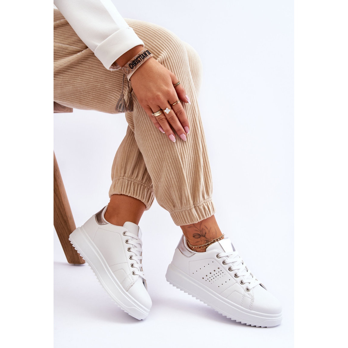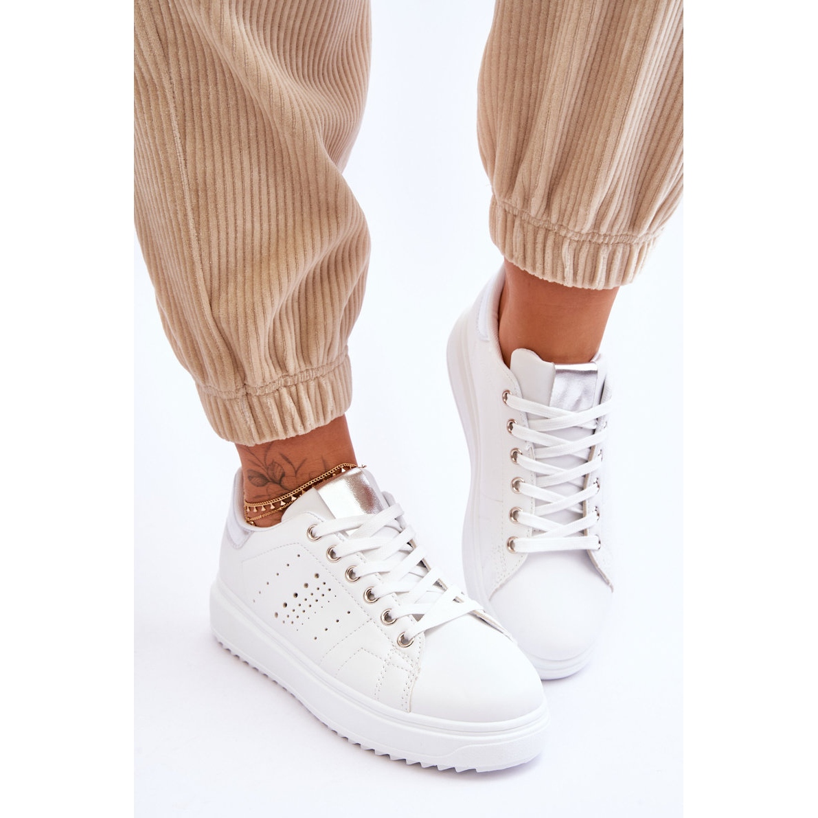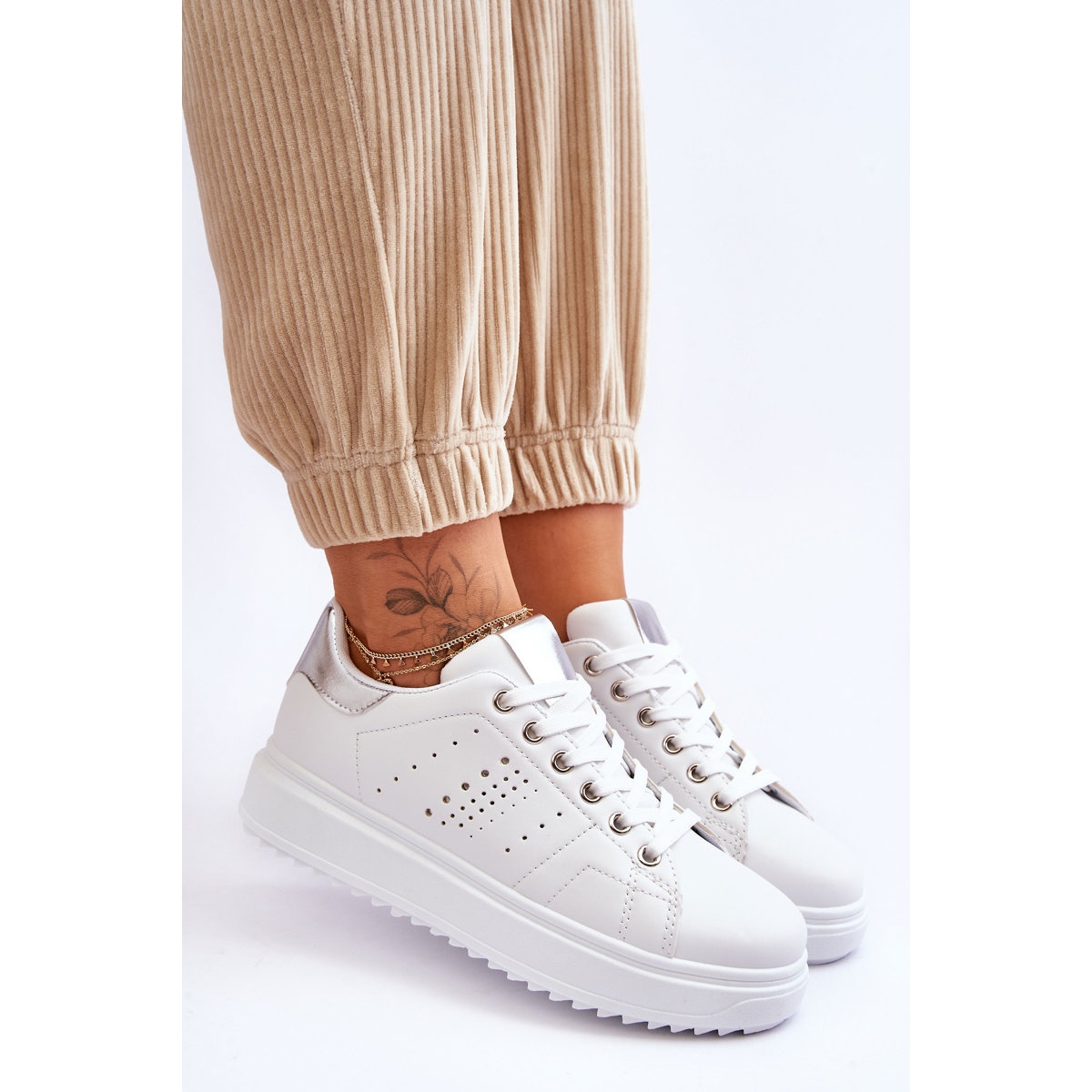 Pantofii sport albi și argintii pentru femei sunt încălțăminte confortabilă pentru utilizarea de zi cu zi. Sunt confectionate din piele ecologica, ceea ce le face expresive si moderne. Pantofii au o platformă masivă de 4 cm înălțime și o parte superioară joasă de 7,5 cm înălțime. Căptușeala este din material textil, iar talpa din plastic. Modelul este dantelat clasic, ceea ce asigura o potrivire perfecta la picioare.