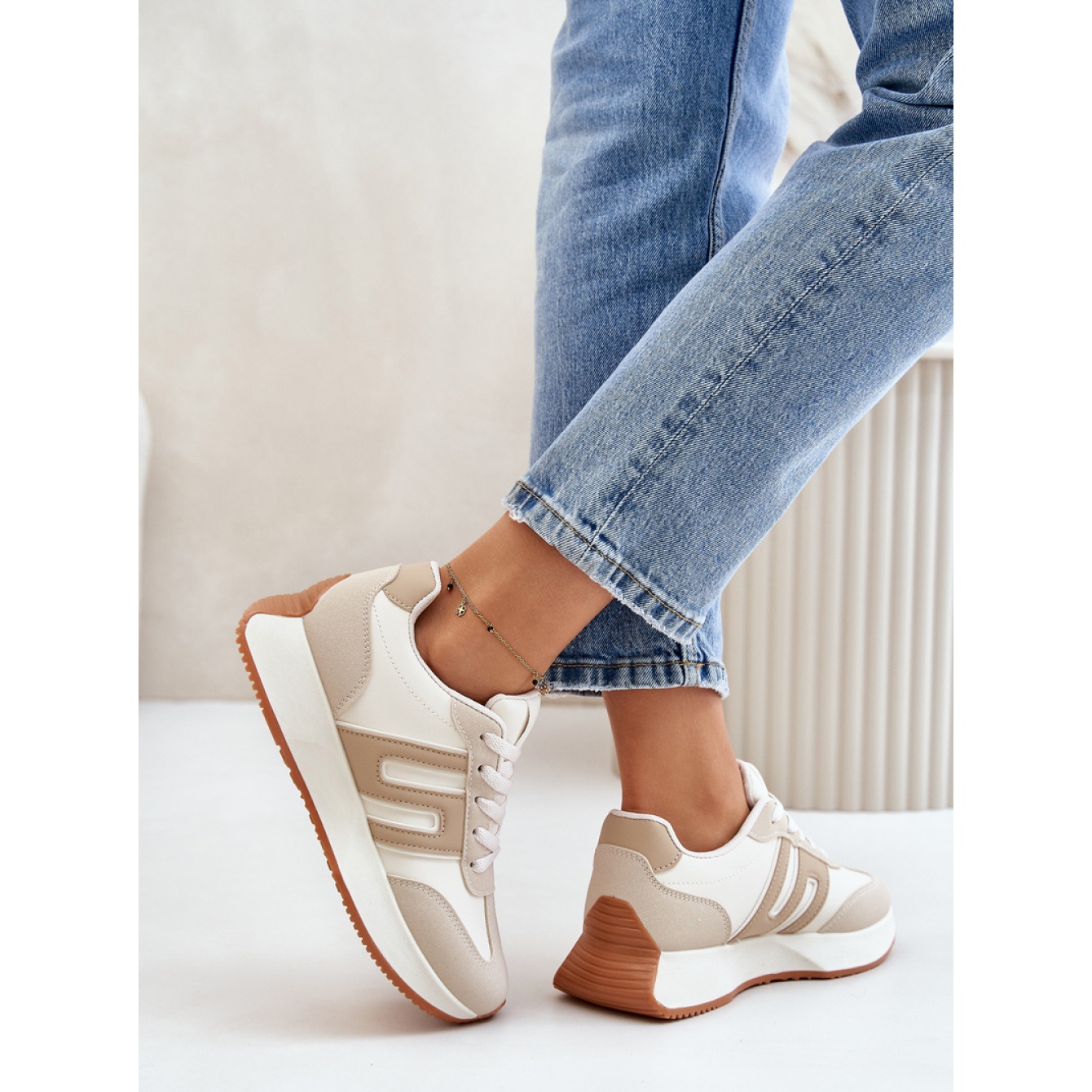 În interiorul pantofilor există o inserție de spumă detașabilă, care se adaptează la forma piciorului, garantând confort chiar și în zilele lungi. Înălțimea superiorului de 7,5 cm subliniază perfect figura feminină, iar culoarea bej face ca adidașii să se îmbine perfect cu diverse stilizări - atât casual, cât și puțin mai elegant.
