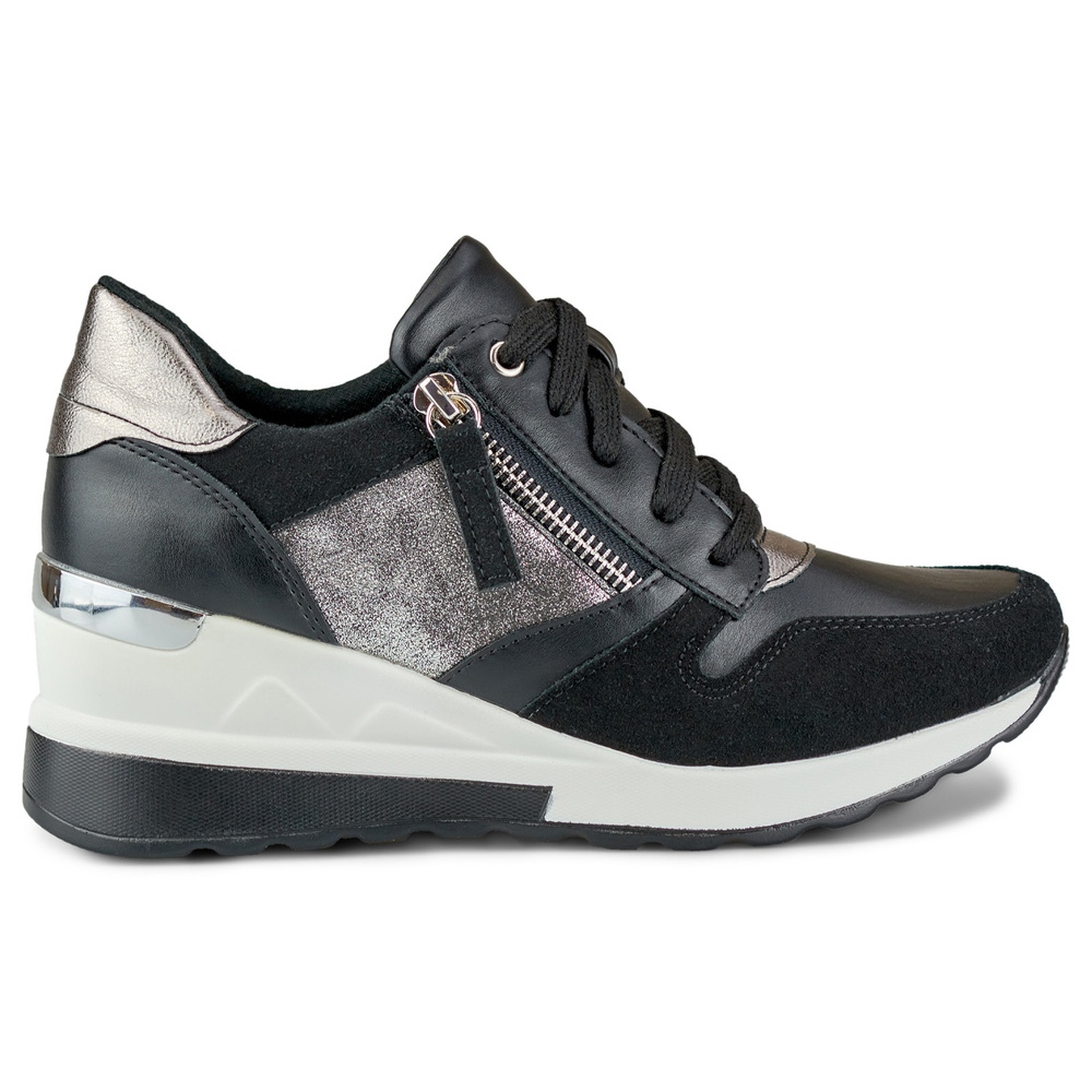 Modern, feminin și confortabil - pantofi sport negri pe pană din colecția Keeshoes combină un personaj sportiv cu o creștere subtilă. Perfect pentru stilizări urbane, în fiecare zi și rezultate, când doriți să adăugați câțiva centimetri fără a renunța la confort.