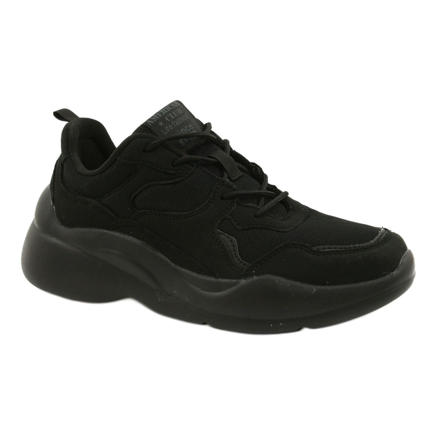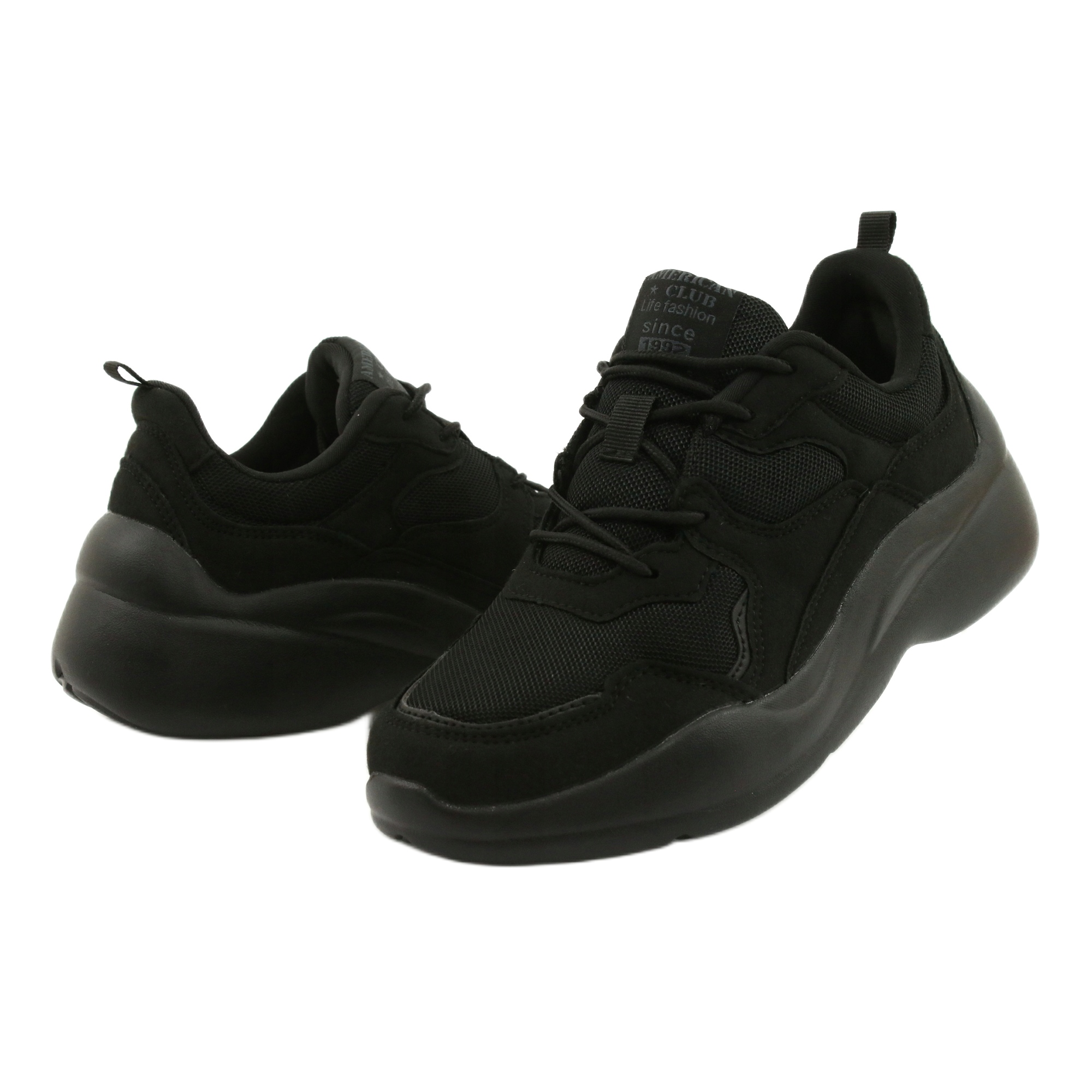 American Club WT3 - Pantofi sport negri, ușori, pe spuma EVA, care combină confortul zilnic cu un stil universal. Fabricate din plasă respirabilă cu întăriri din piele de căprioară, vor lucra în timpul plimbărilor, a activităților sportive de naveta și ușoare. O tăietură neagră simplă, atemporală, se potrivește cu multe stiluri și va fi o alegere bună pentru femeile de toate vârstele.