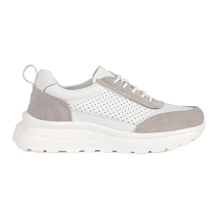 Acești pantofi se disting printr -o talpă groasă, albă, cu o înălțime de 4 cm, ceea ce asigură o amortizare excepțională și purtând confort. Construit -călcâiul și o stabilitate completă, rotundă a nasului, iar utilizarea materialului extern din piele și o inserție naturală din piele îți face picioarele să respire, ceea ce este extrem de important într -o zi activă.