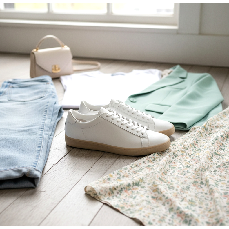 Vara, un dulap capsulă are nevoie de o pereche de pantofi eleganți deschisi. Sandalele cu bretele – fie clasice plate sau cu toc mic – indeplinesc perfect acest rol. În sezonul 2026, sunt deosebit de populare sandalele cu catarame aurii, care se potrivesc atât cu rochiile de vară, cât și cu pantalonii scurți și cămășile de zi cu zi.
