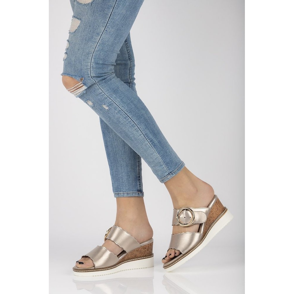 Modelul DK2078/21 GO se distinge printr-un finisaj subtil, metalic, care va adăuga strălucire oricărui stil. Inaltimea panei de 7,5 cm si inaltimea platformei de 1,5 cm garanteaza confort si in acelasi timp alungesc optic picioarele. Forma rotundă a degetului de la picior face șlapii nu doar estetici, ci și funcționali.
